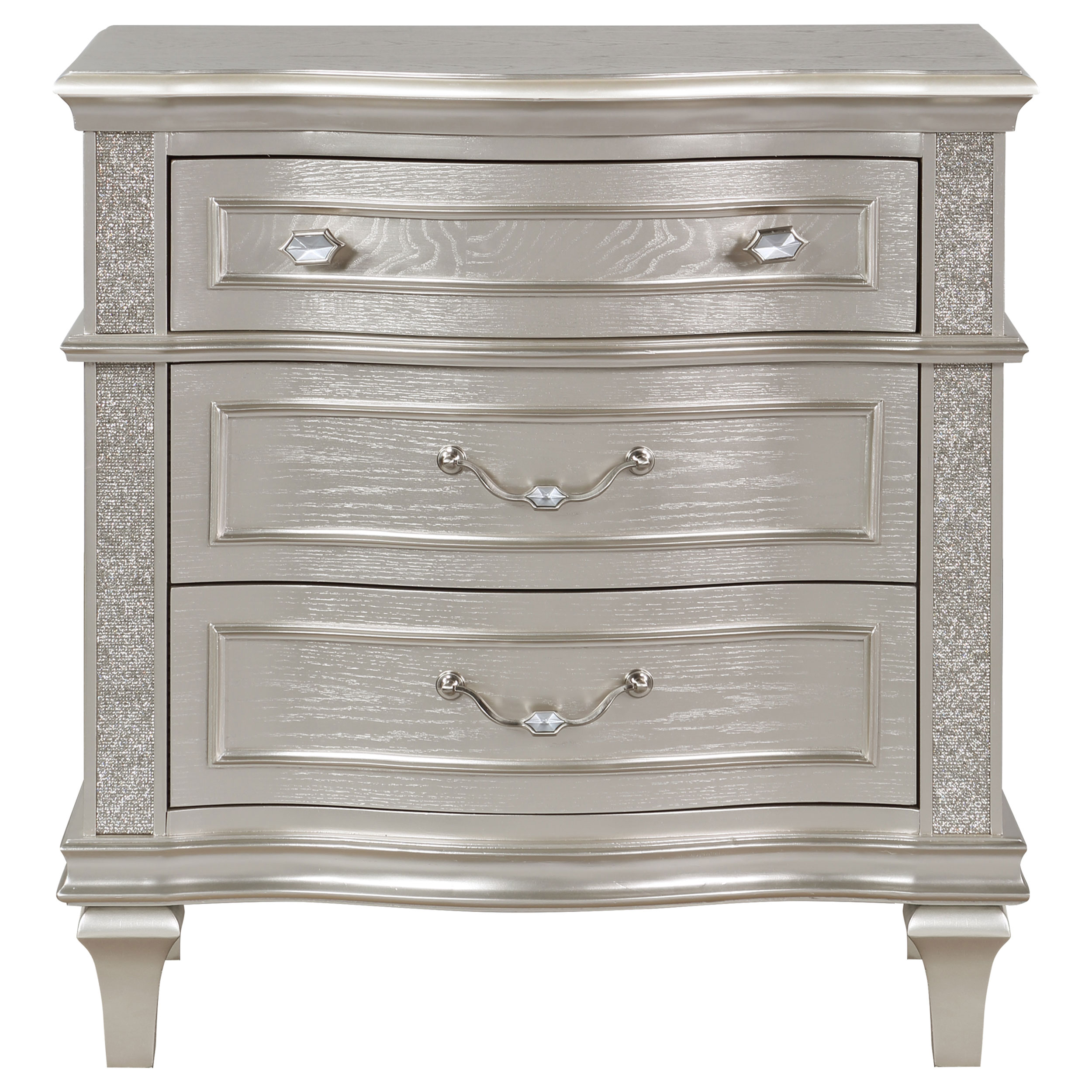 Keep all your bedroom essentials and wardrobe items neatly organized with this glam three-drawer nightstand. A contoured frame design features sparkling side panels flanking the three spacious drawers for a luxurious touch. A silver oak finished wood frame is accented further by modern glam metal knobs and bail handles that help slide each drawer with ease. A soft grey felt-lined top drawer invites you to store more delicate items. A hidden USB outlet creates a convenient charging area for handheld devices.