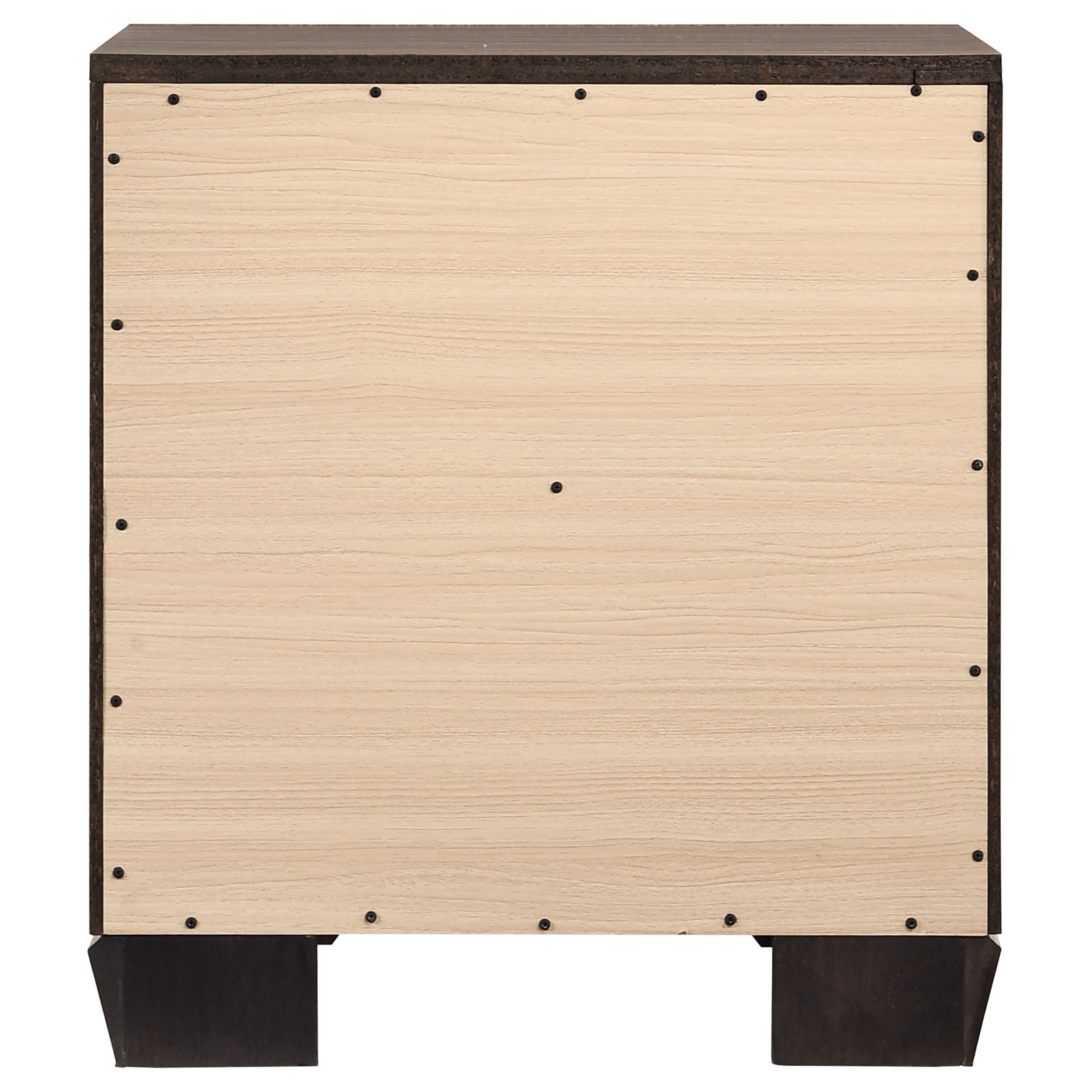 Crisp lines and warm hues are showcased in this transitional two-drawer nightstand. Covered in a soft washed taupe finish, the clean silhouette is given visual intrigue with an exposed wood grain in natural oak. Elongated, crisp metallic hardware creates sleek contrast. Constructed with black recessed grooves around picture framed case fronts, the front of the frame is elongated with tapered legs. Dress up the greyish brown hue of the patina with a vase of fresh flowers or a sculpture-inspired lamp.
