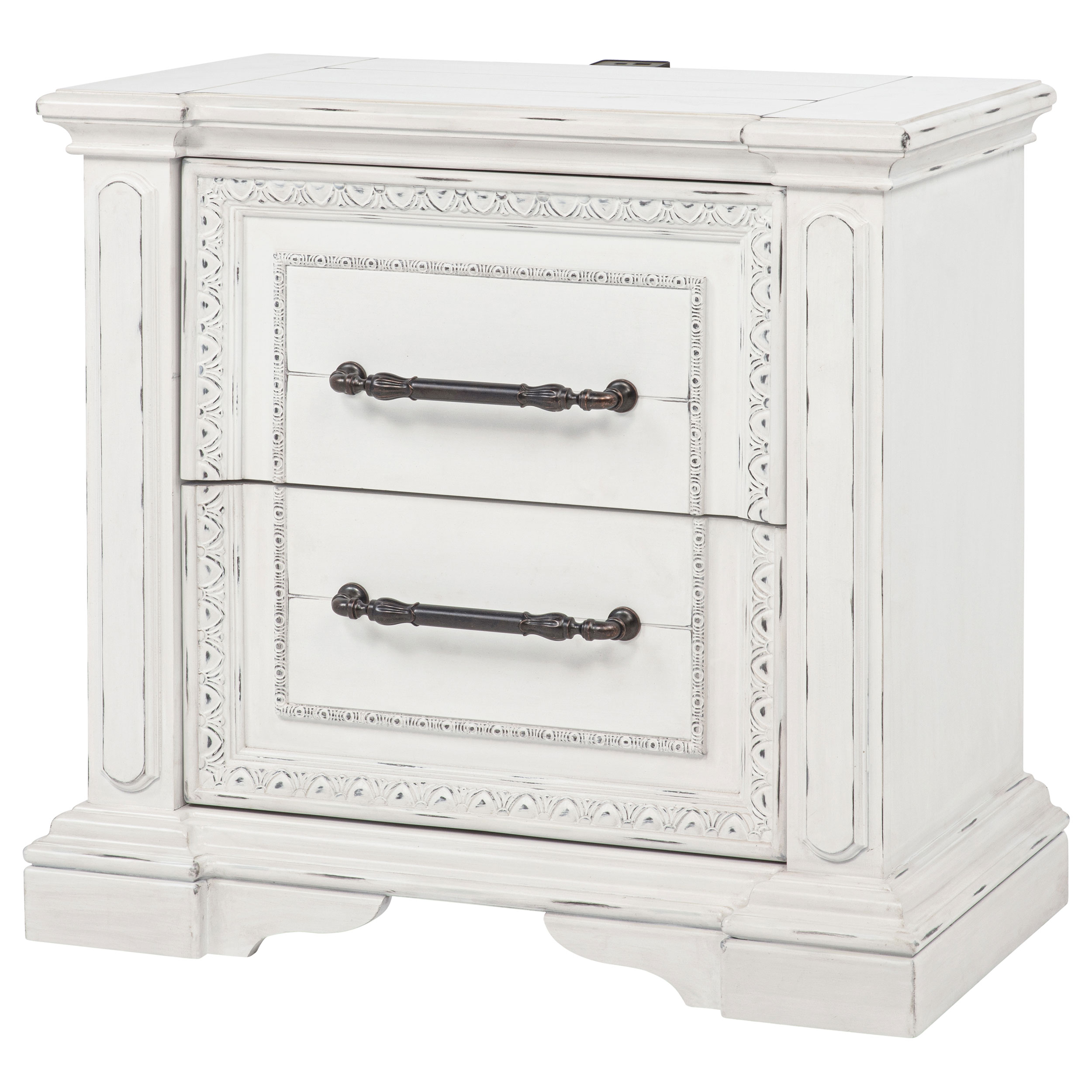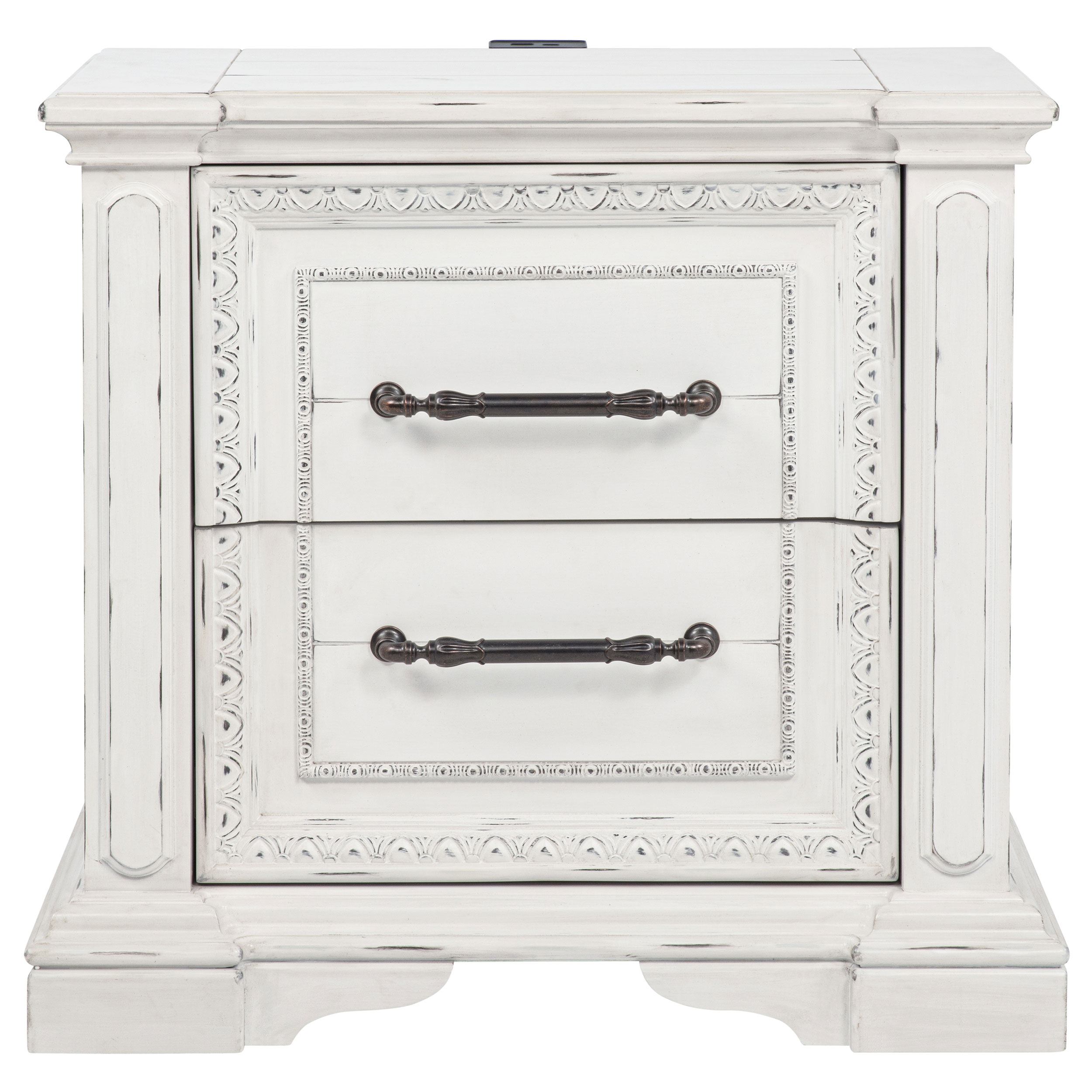 Charming and functional, this two-drawer nightstand blends classic design with thoughtful details. A vintage white finish softens the ornate carvings and sculpted base, while antique bronze handles bring graceful contrast. Dual USB ports are hidden at the back for modern convenience, while felt-lined drawers offer protected storage. Built from poplar and engineered wood, it balances timeless beauty with everyday function.