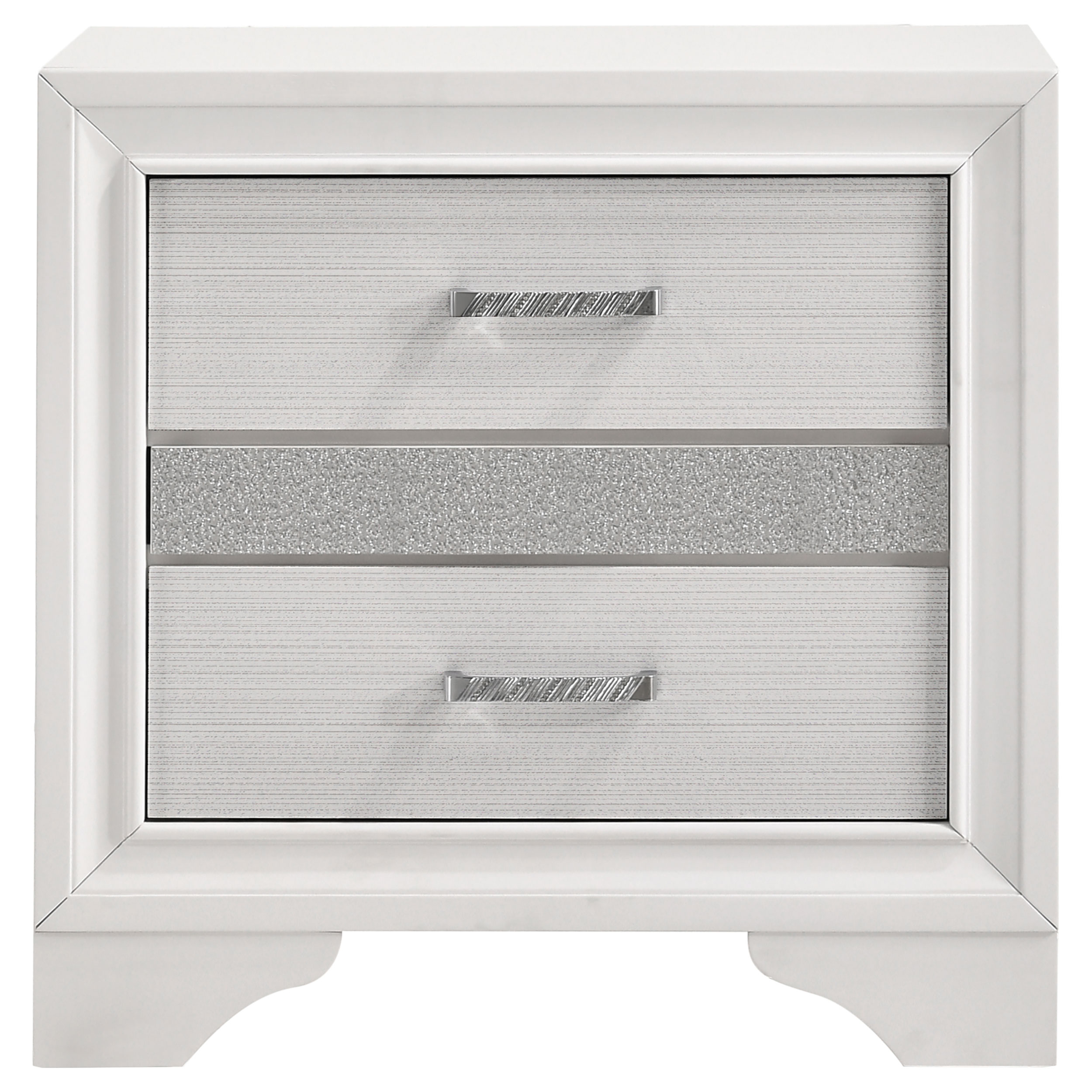 - Crystal drawer pulls enhance the glamorous design