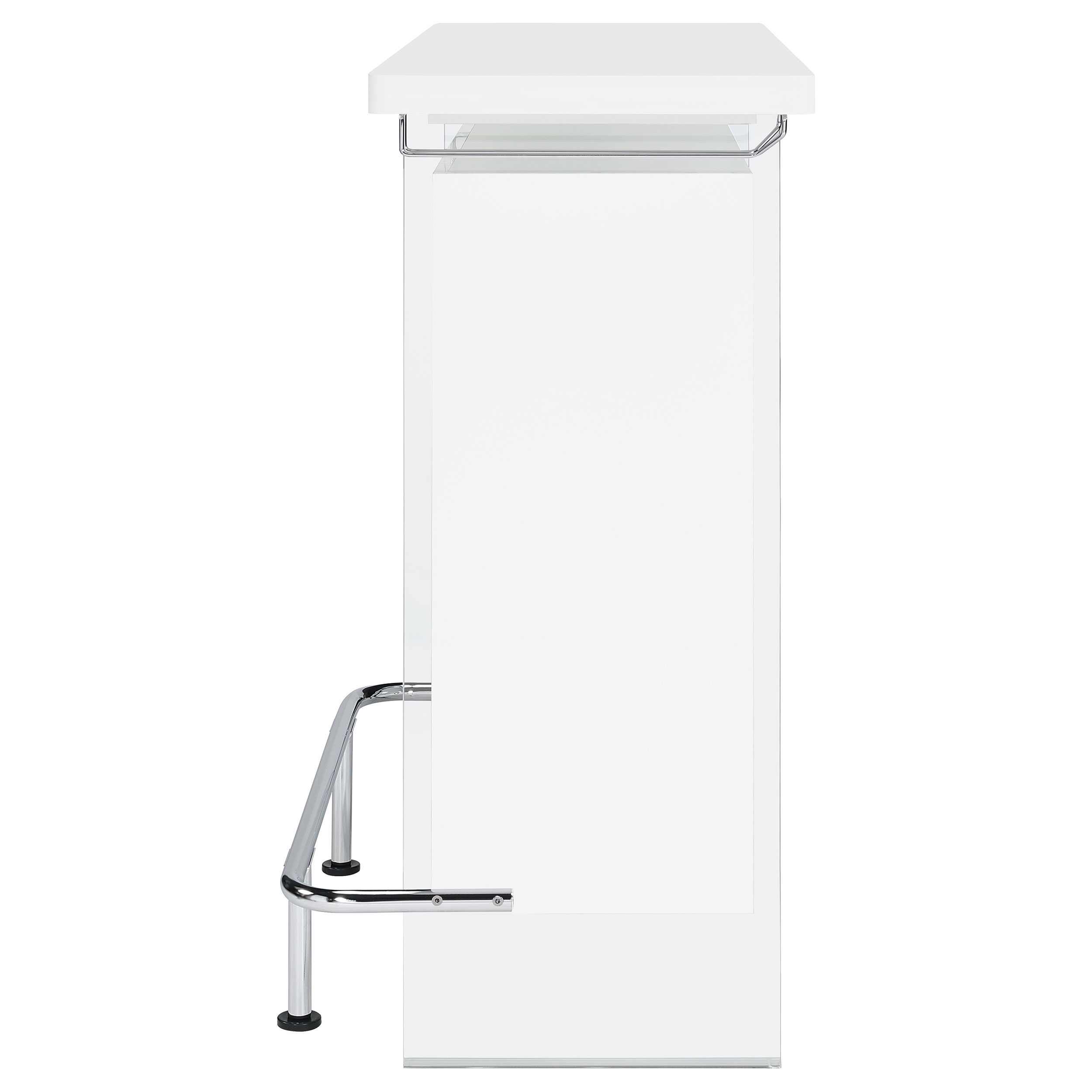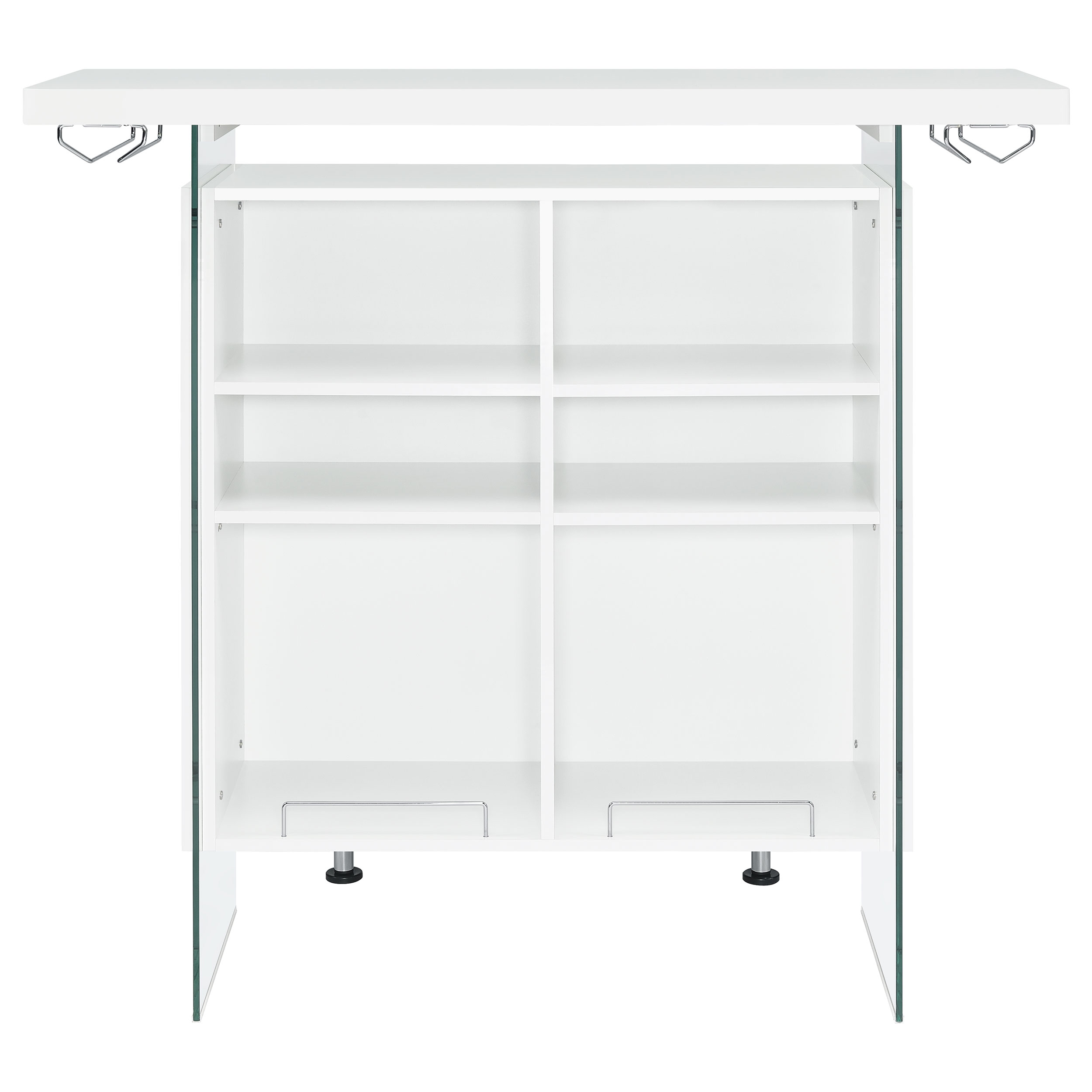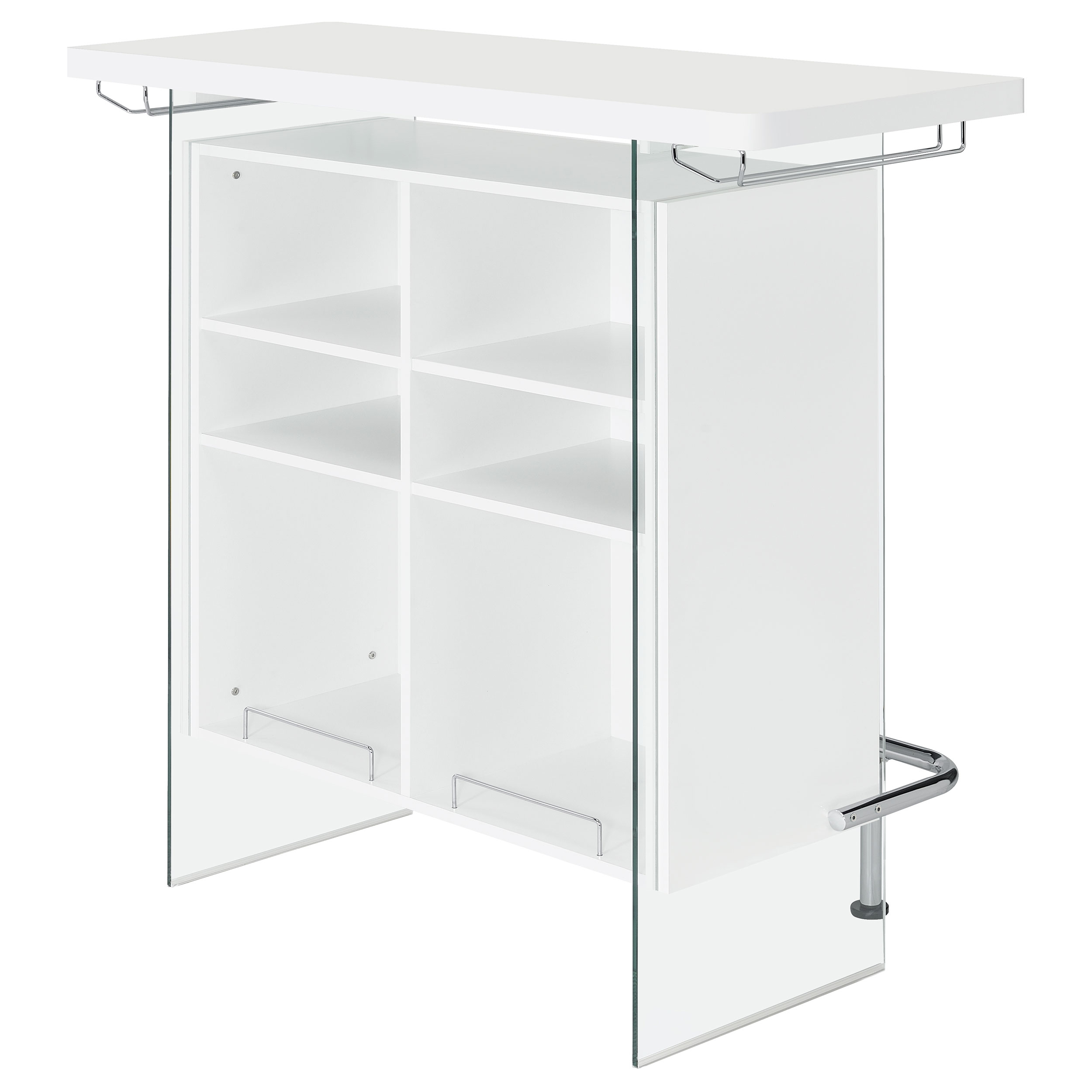 Elevate a multipurpose living room with this modern bar unit. A neutral finish, accented with polished chrome metal accents offers a striking design contrast. Supported and flanked by clear tempered glass side panels, this bar unit boasts ultra-modern elements as well for a dramatic feel. Compact yet highly functional, this bar unit also features ample storage space with six built-in open shelves for storing bottles, serving pieces and other mixologist must-haves. Tucked beneath the bar top along each side is a stemware rack for wine glasses and more.