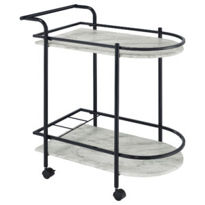 Minimal, clean lines create a versatile and sleek aesthetic to this contemporary serving cart. Built with a slim metal frame in a black hammer tone powder coated finish with caster wheels, this serving cart welcomes glassware, accessories and snacks to be smoothly transported to an entertaining area for guests and visitors. Stacked clear tempered glass shelves showcase stemware and favorite vintages to guests for their personal selection. With raised edges, you can rest easy knowing everything stays in place safely. Glide this serving cart into your living room for small get-togethers or keep it in a compact apartment as a multifunctional bar cart.