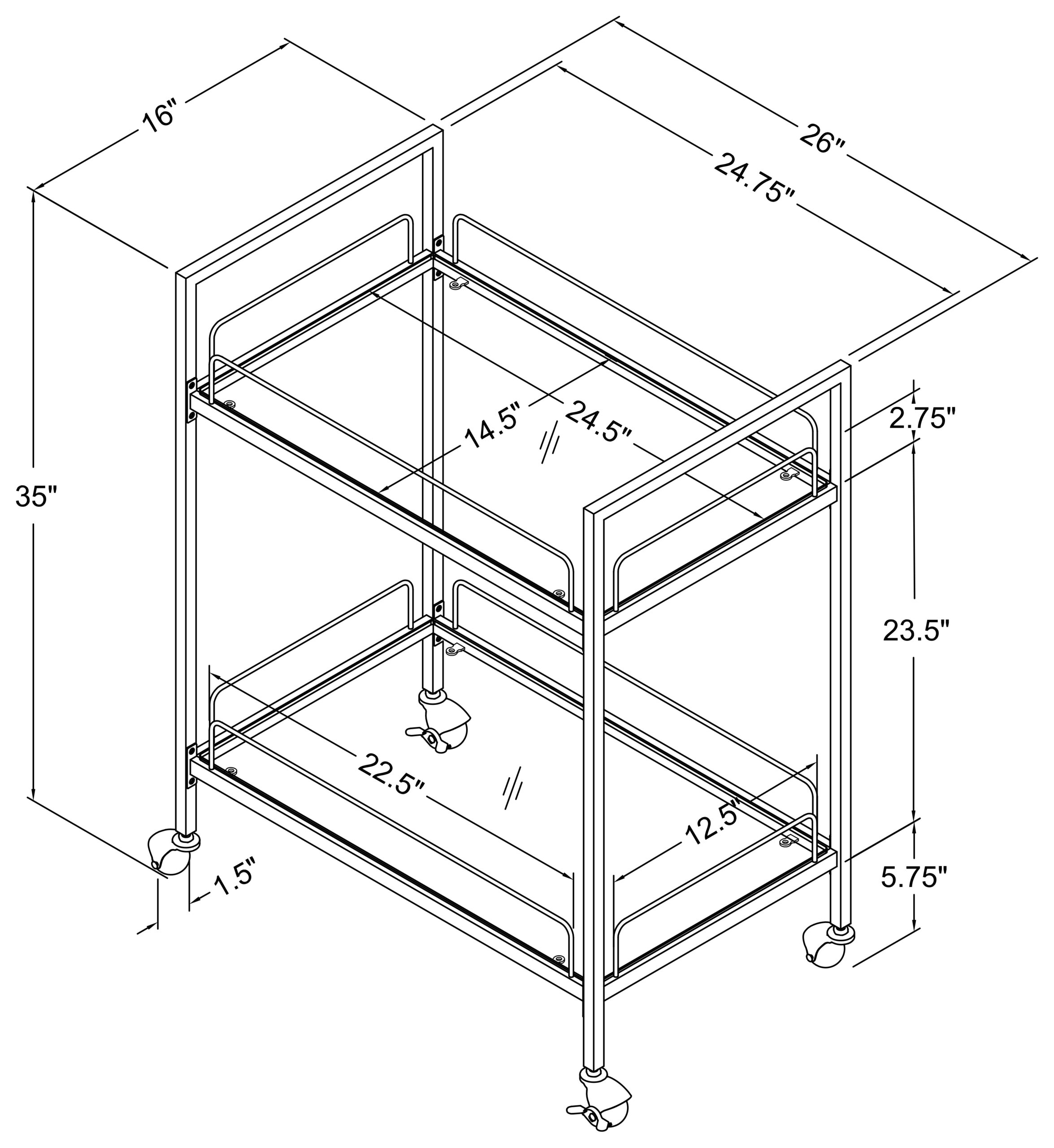 Minimal, clean lines create a versatile and sleek aesthetic to this contemporary serving cart. Built with a slim metal frame in a black hammer tone powder coated finish with caster wheels, this serving cart welcomes glassware, accessories and snacks to be smoothly transported to an entertaining area for guests and visitors. Stacked clear tempered glass shelves showcase stemware and favorite vintages to guests for their personal selection. With raised edges, you can rest easy knowing everything stays in place safely. Glide this serving cart into your living room for small get-togethers or keep it in a compact apartment as a multifunctional bar cart.