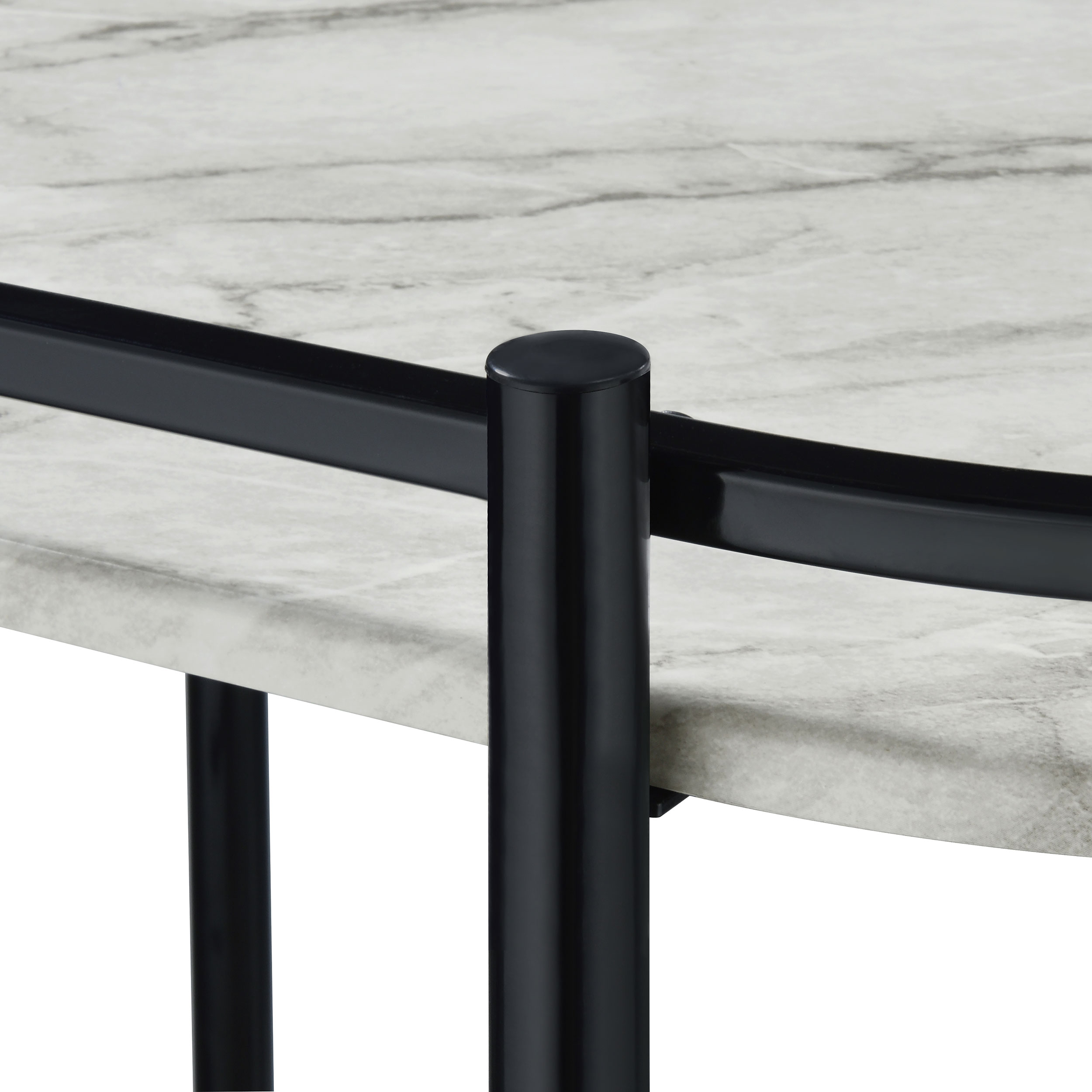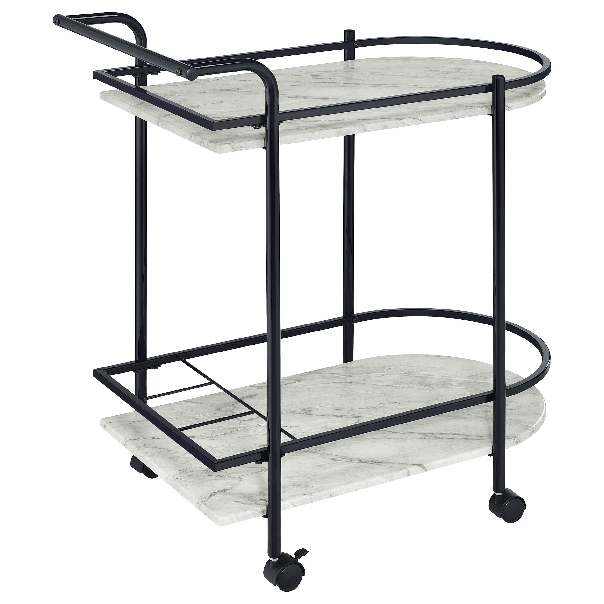 Invite guests over for an intimate soiree and serve up cocktails on this contemporary bar cart. Classic faux white marble shelves stack on top of one another, lending a traditional approach to its sleek modern silhouette. Rounded edges on one side add to the graceful appeal of the elongated shape. Designed in a metal frame with slim railing all around to keep bottles in place, this bar cart is ready to glide across floors. Lockable rolling casters secure it in place.