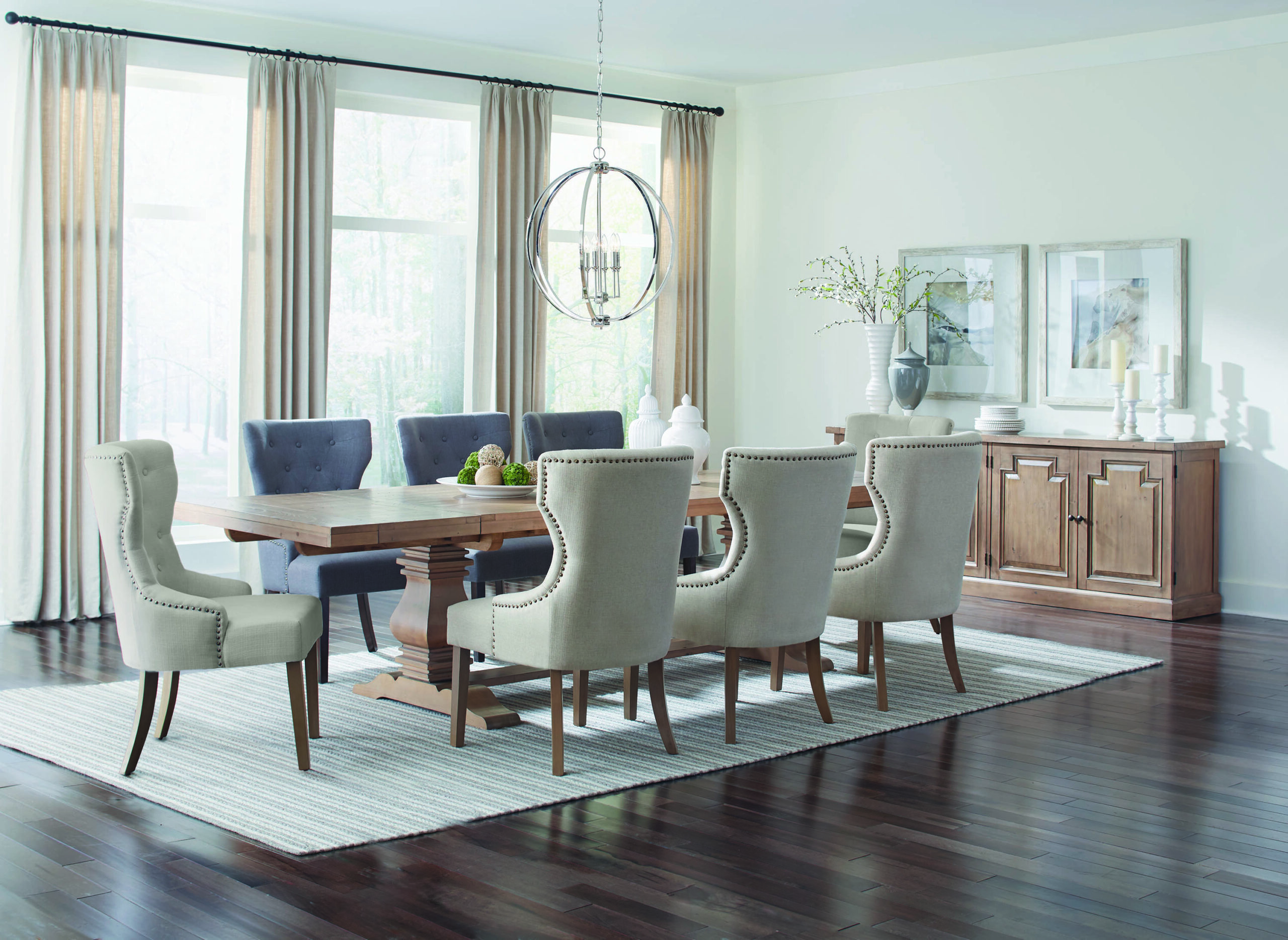 - Contrasting legs in warm brown finish add a balanced look with curves and tapers