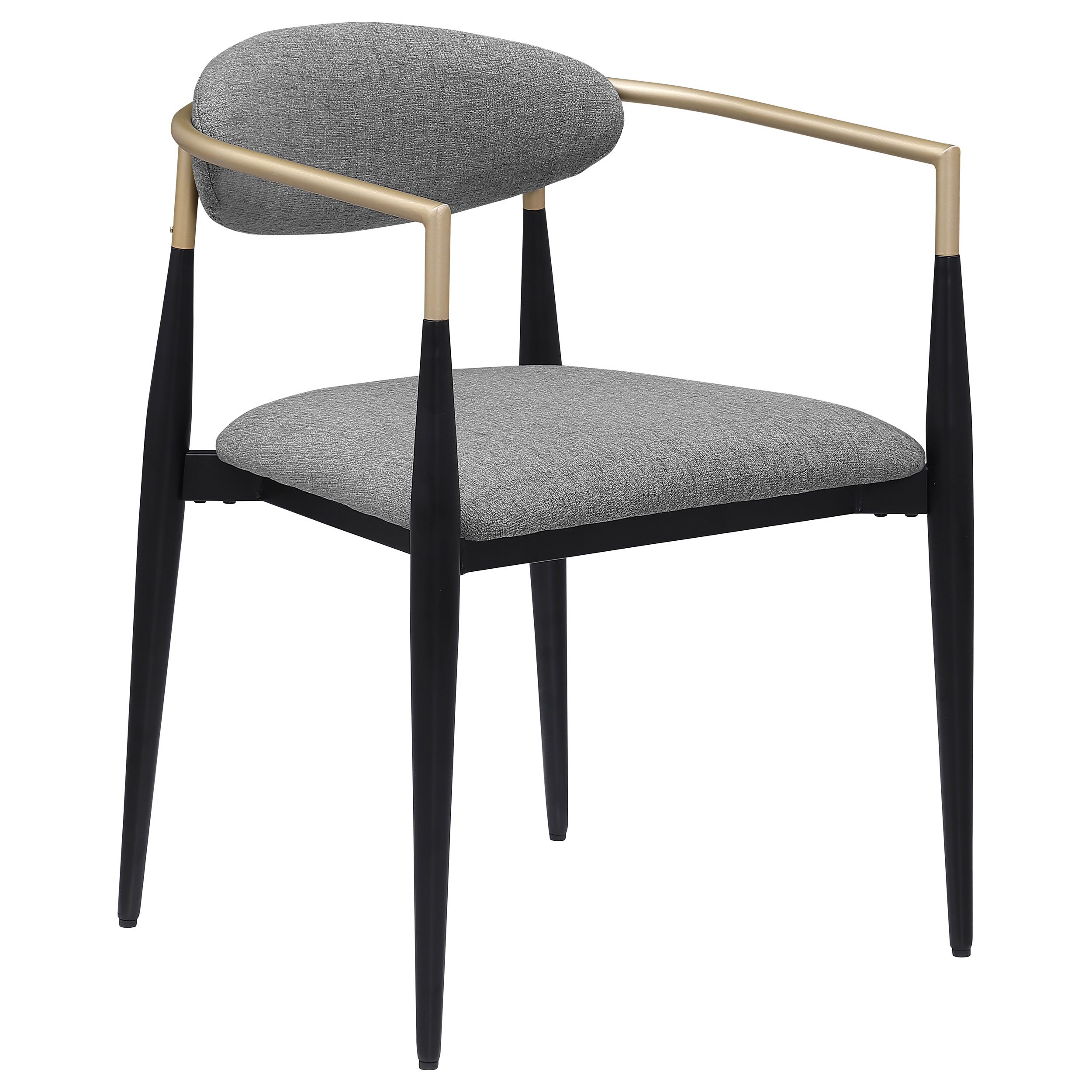 Refresh your dining table with the modern glam flair of a set of two armchairs. Perfect for family and friends, the chair offers impeccable comfort with a padded seat and an oval-shaped backrest with a gentle curvature for excellent support. Its metal frame offers stability and strength, complete with a black powder coated finish. A gold finish is hand-painted on armrests, adding gleaming metallic appeal and warmth. Each chair offers a slim, sleek silhouette, perfect for a modern or mid-century space.