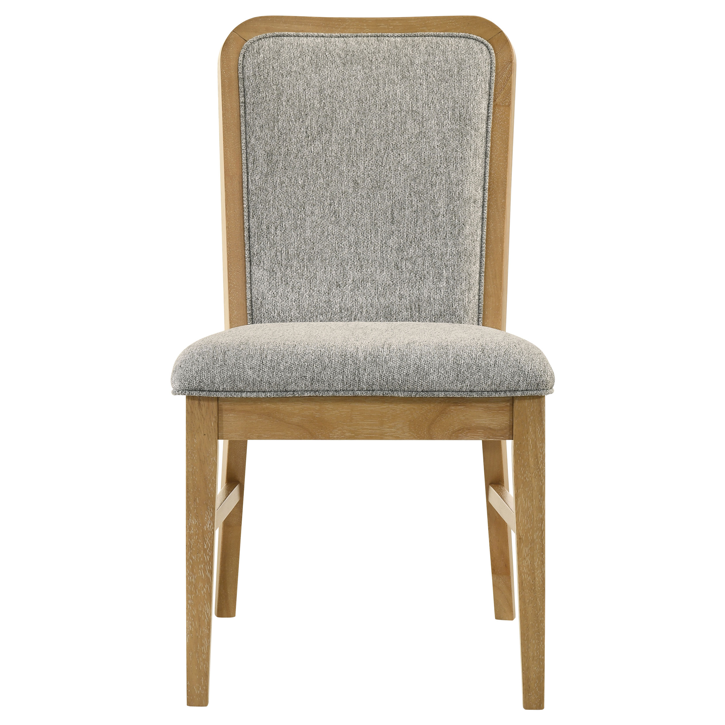 This dining side chair blends mid-century inspiration with plush modern comfort. The curved back is designed to gently hug the body, upholstered in soft grey fabric that adds inviting texture. A weathered natural wood frame with rounded posts and softened leg corners brings subtle character without excess detail. Padded with dense foam for lasting support, it’s crafted from solid wood and engineered components to offer both durability and everyday ease in the dining room.