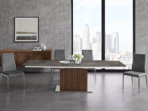 This dining table has smooth clipped corner edges with a beautiful grey tone faux marble design. The channel back chairs add comfort and great design elements and the matching bench ties it all together.