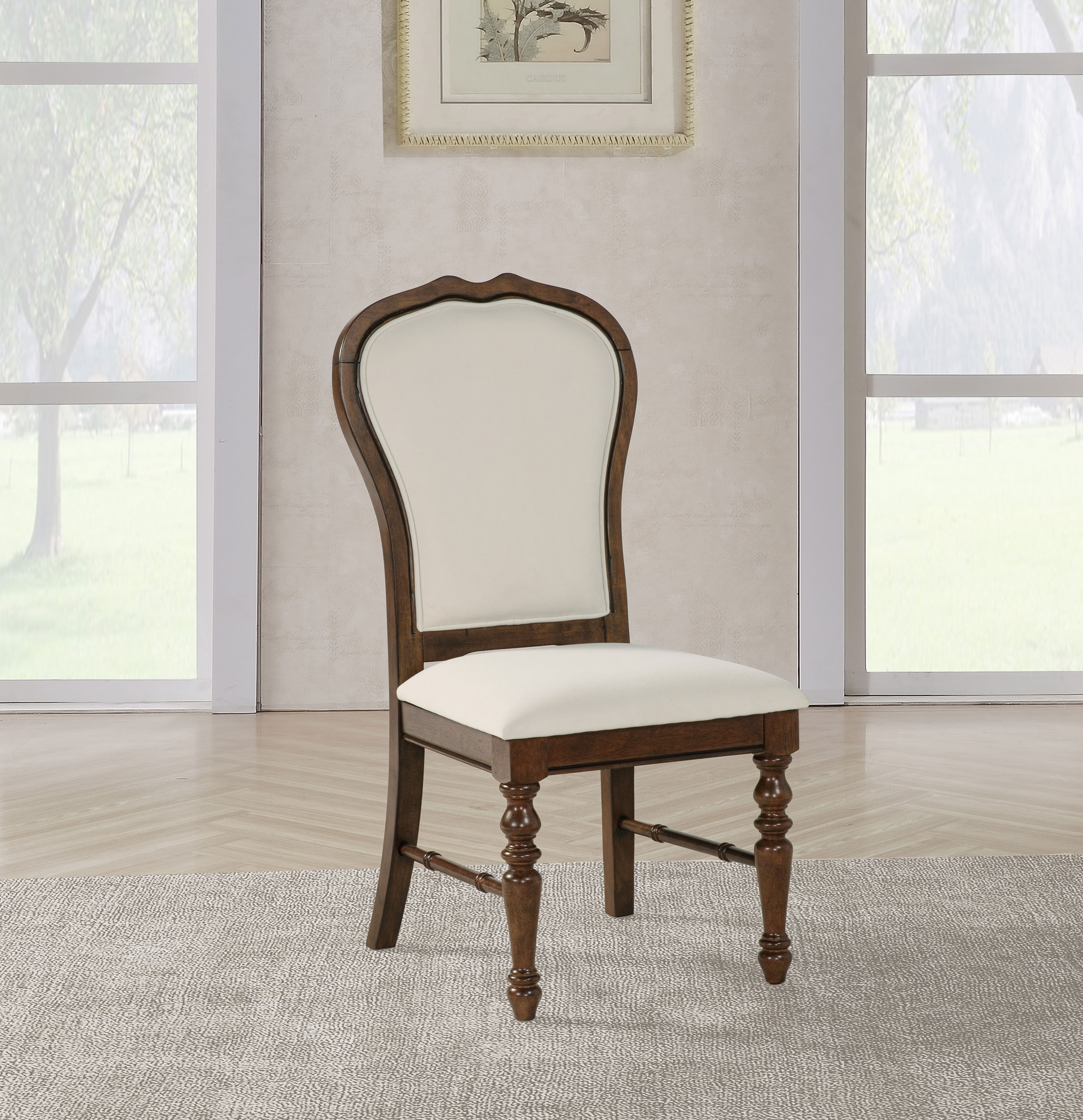 Complement your chic dining ensemble with a set of two traditional dining side chairs. Each boasts durable construction in rubberwood, complete with a rich brown finish. Chairs are designed with decorative rounded backs, framed in wood to create definition and character. Upholstery is paired with foam and features a crisp ivory color, creating contrast and depth against the rich wood grain. Legs are turned, with decorative stretchers that add detail and intricacy to your kitchen or dining room.
