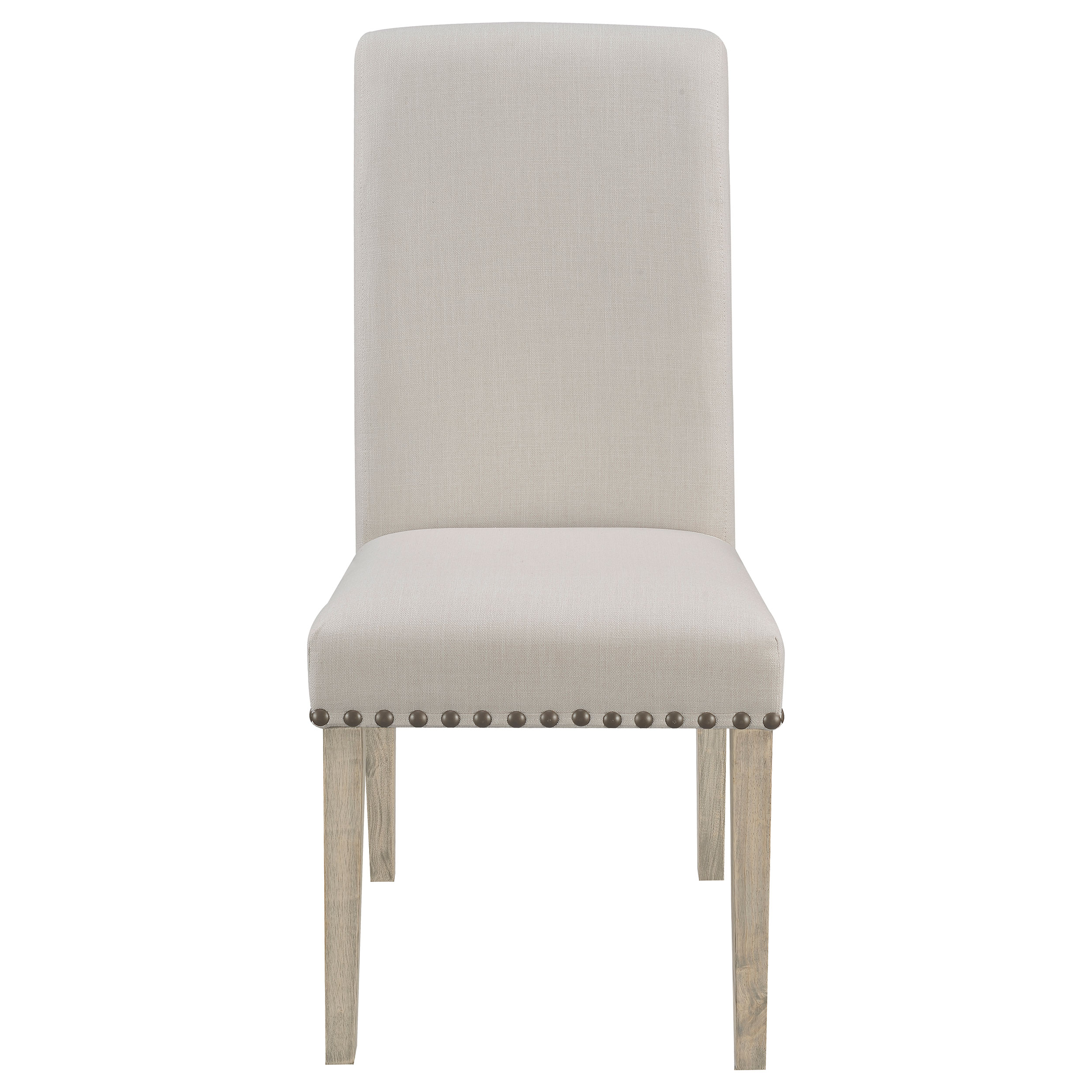 Appreciate the sophisticated look of a tall silhouette with fresh, inspiring style. This dining chair offers a versatile look that blends well with glass, wood, or metal tables. Transitional in motif, it combines invigorating modern touches with classic elements. A neutral upholstered wrap generates light, airy ambiance. Charming nail heads line the bottom of its seat edge, and narrow tapered legs with a neutral finish balance a stylish palette.
