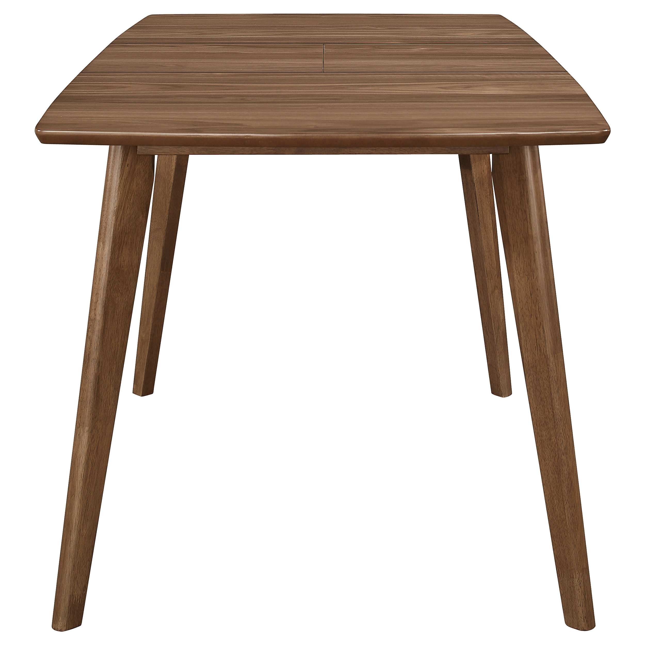 Mid-century modern-inspired, this five piece dining set welcomes a hint of retro pizzazz. In a natural walnut hue, the sleek table is given depth by an exposed wood grain. Tapered legs create an elegant and open look, elevated with clean style. The four included side chairs feature an armless silhouette and grey upholstered seat. The delicate cushion and streamlined back look mod and stylish.