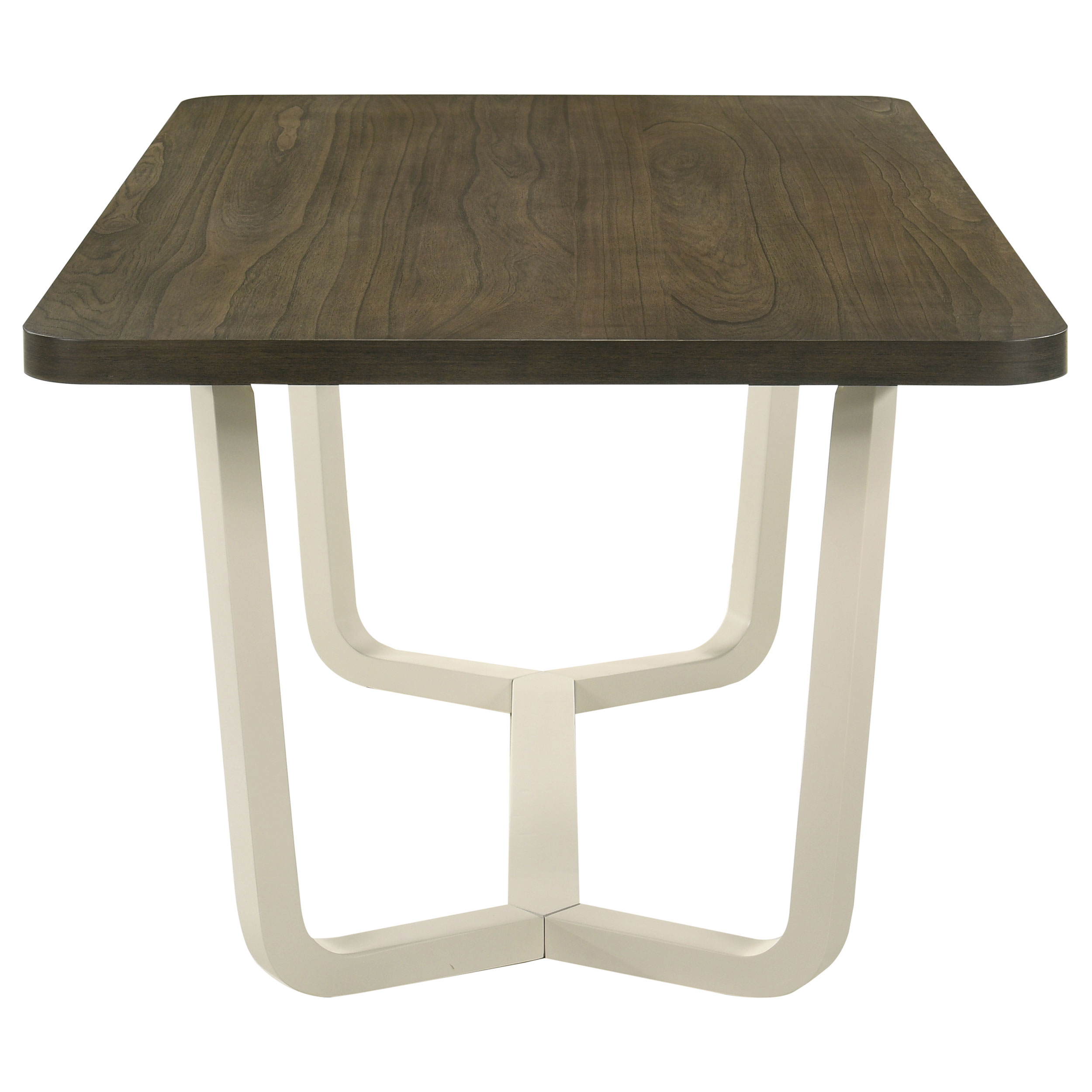 Refresh a family dining space with the cool hues and eye-catching design of this modern dining set. It includes a rectangular table and side chairs, creating an inviting centerpiece in your dining room or eat-in kitchen. The table boasts a two-tone finish with a rich wood grain tabletop complete with rounded corners, and a white finish base with chic angularity. Chairs are plush and comfortable, complete with gray fabric upholstery over plush cushions that create streamlined aesthetics in your space. The tri-tone combination is fresh and inviting, perfect for a welcoming space to catch up with friends and family.