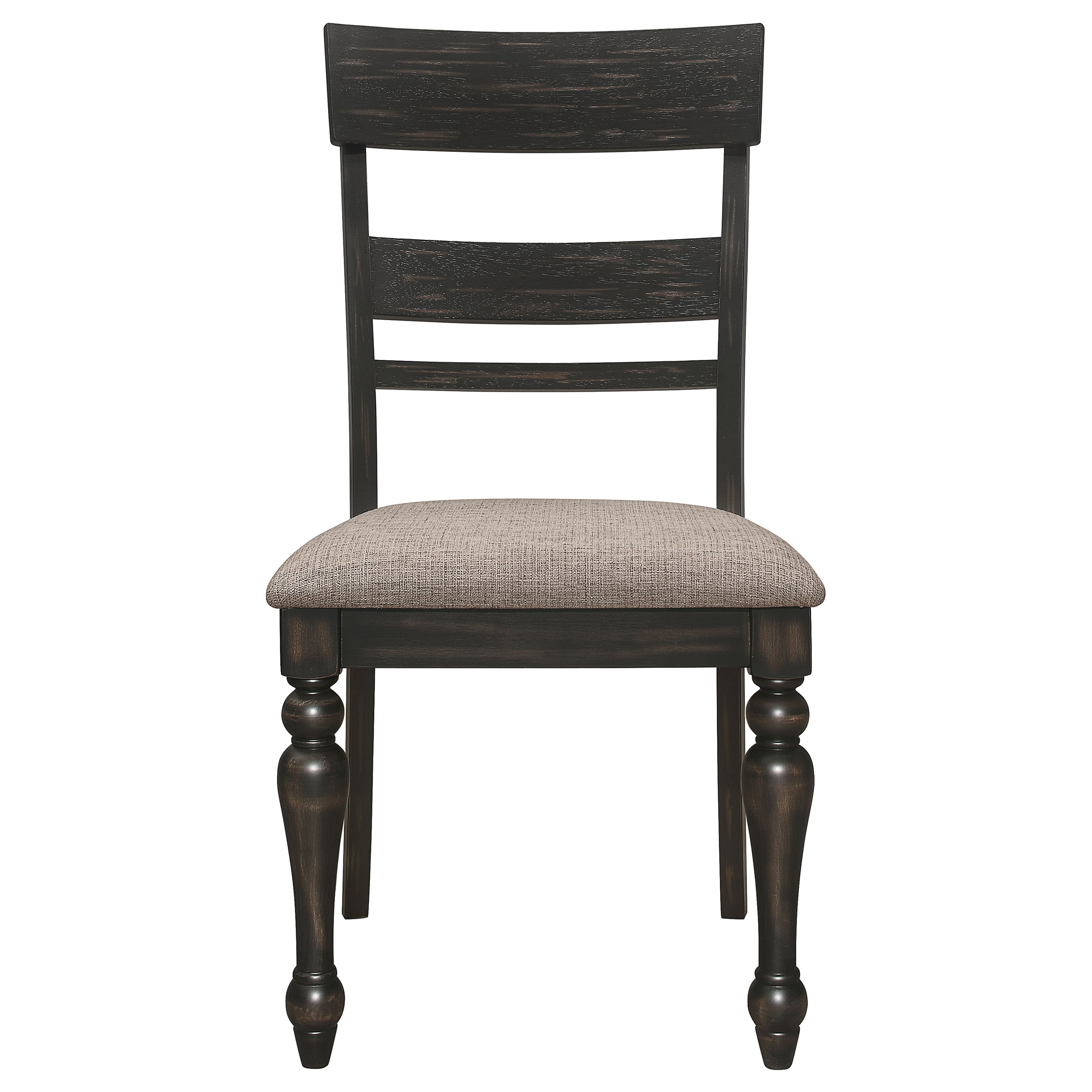 Traditional attitude is bold and rustic with modern updates adding style to your dining area. This five-piece dining set brings out the best in a hybrid aesthetic of farmhouse and mid-century looks with a soft, versatile color and finish palette and construction of rubberwoods and wood products. A rectangular table mixes finishes between its brown brushed finish top and a glam charcoal sand through finish base and legs. Curvy lines and turned legs add an alluring feel to a table playing host to brown finish ladderback chairs. A smoothly arched side silhouette with turned front legs creates a glam look, embellished with neutral and soft stone brown fabric seat upholstery.