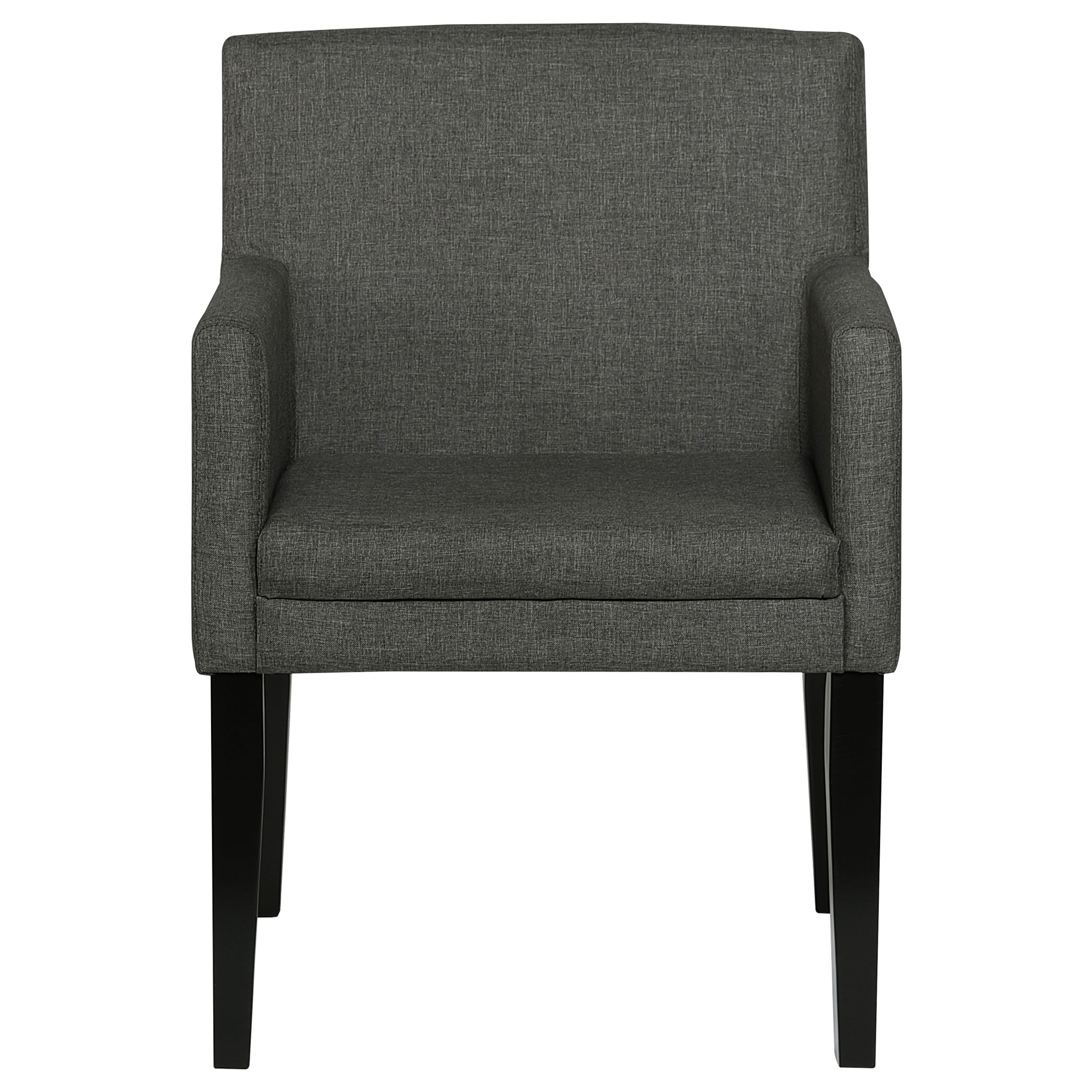 - Dining chairs have cushioned arms wrapped in durable charcoal grey fabric