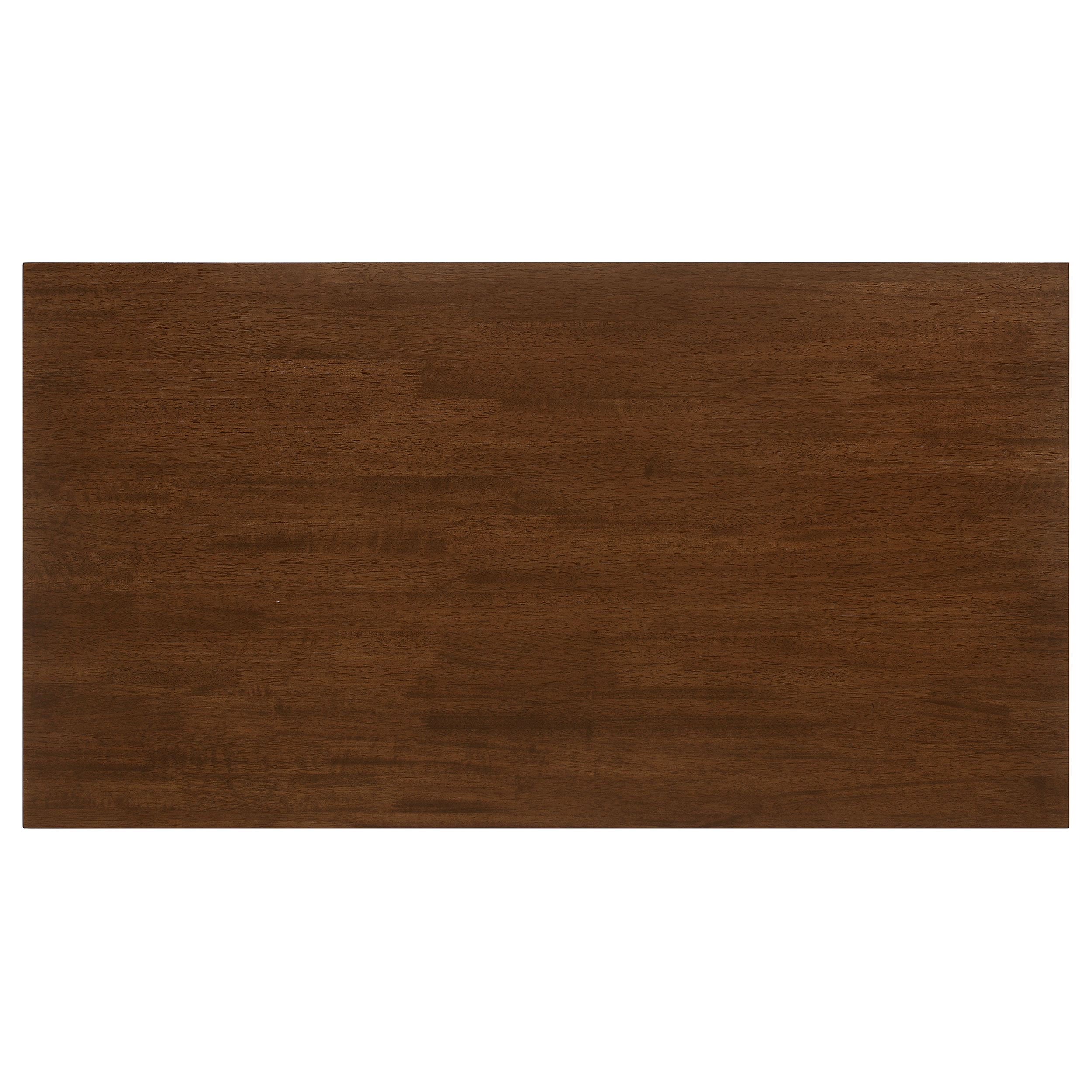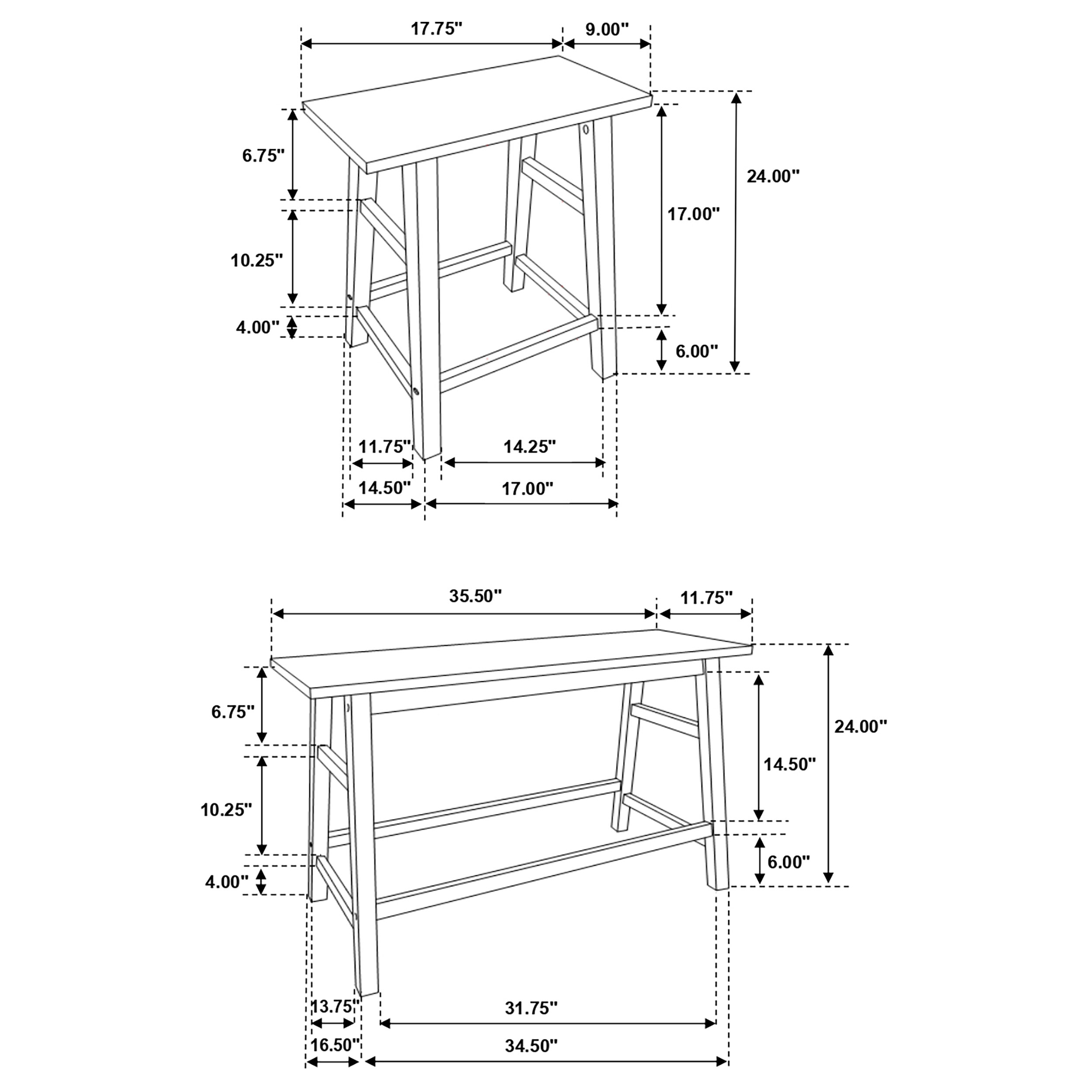 A charming addition to a kitchen breakfast nook or compact dining area, this country four-piece counter height table set gives off modern farmhouse vibes. A two-tone finish offers a subtle contrast and rustic-inspired design. A chestnut finish covers the tops of the table, stools and bench, as the rest on a bold, dark brown finish frame. The narrow rectangular counter height table features a trestle base and straight square legs for a clean lined effect. In addition, the two stools and bench also offer a similar style with square legs that flare out toward the feet and offer a footrest for extra support.