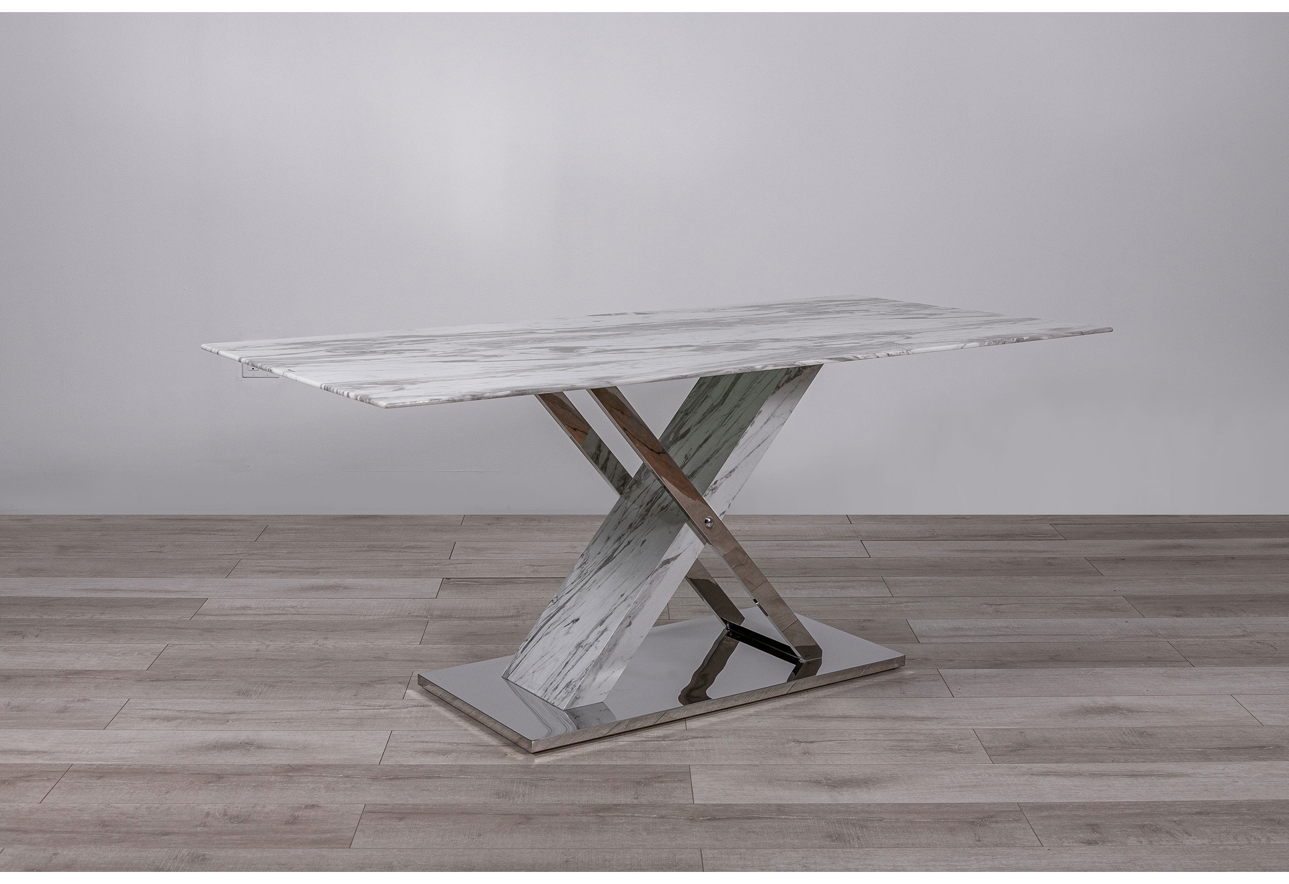 Get all the look of elegant Carrara marble with this stunning yet practical glass-top dining table. Design elements include an x-base design with polished stainless steel accents. This table offers plenty of space for all of your entertaining needs.