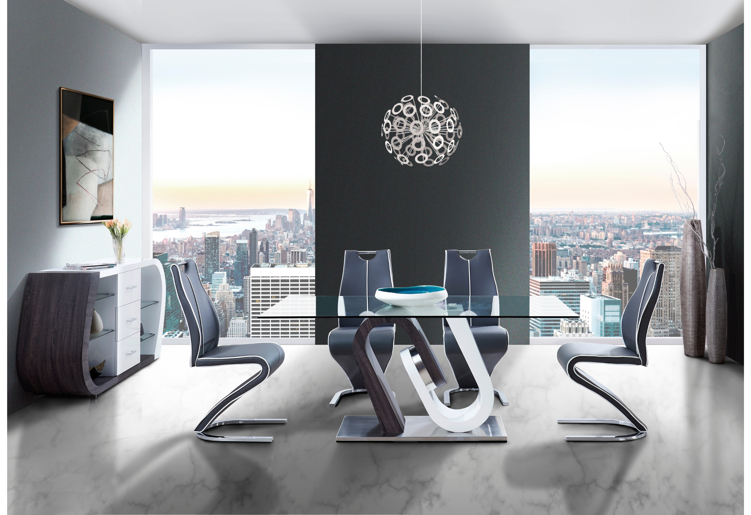 Looking to make an instant style statement then this clear glass top dining table is for you! Design elements include a two toned geometrically designed base fused with a polished chrome accent and a glass top providing enough space for all your entertaining needs.