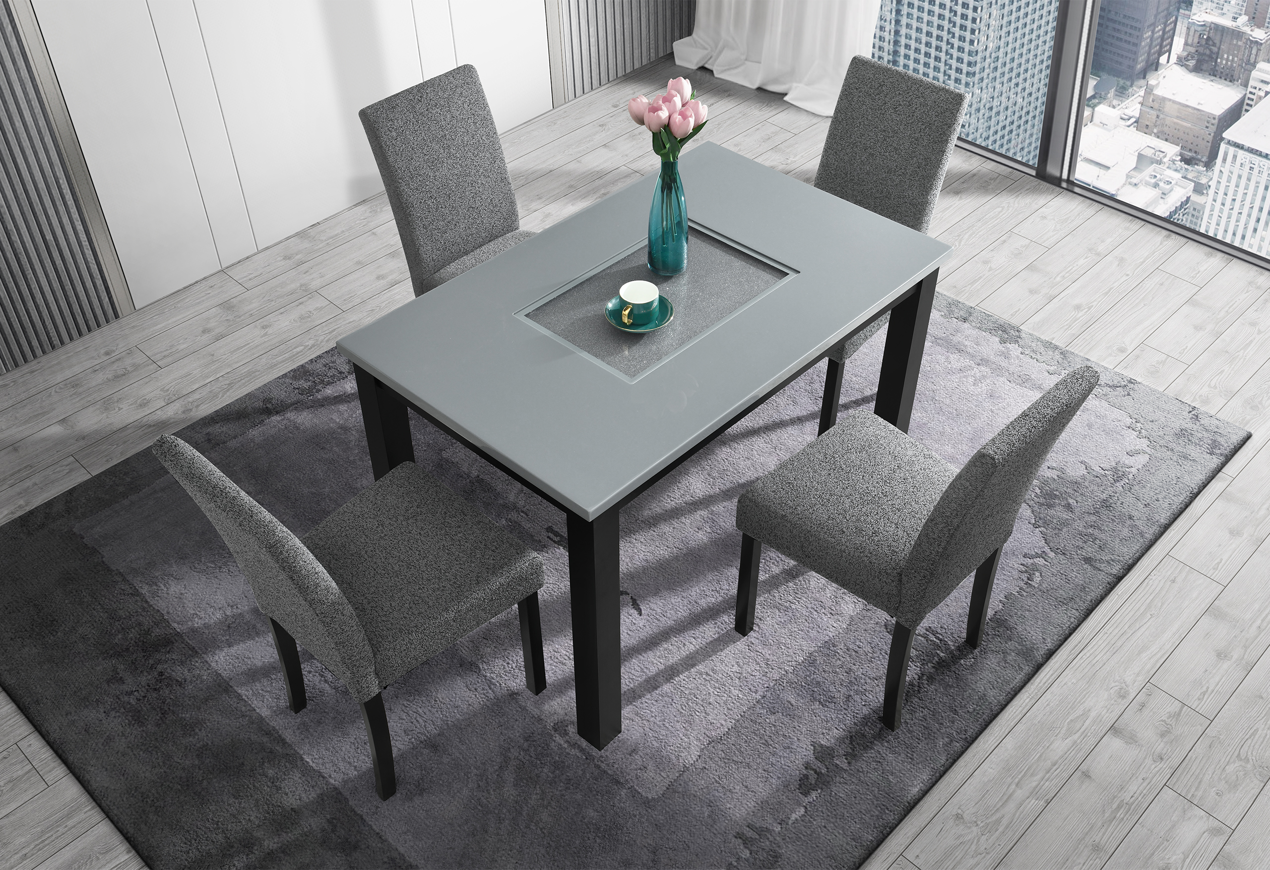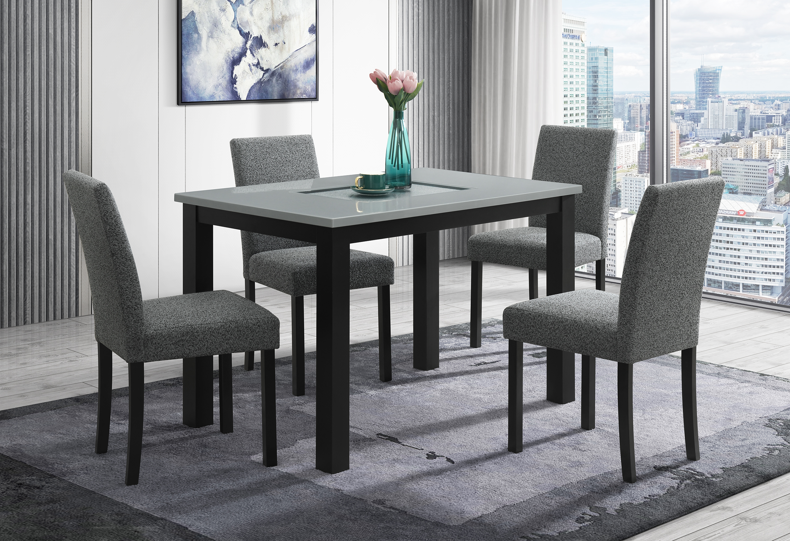 The dining table features a high-gloss dark grey lacquer top that brings a sleek, contemporary vibe to your space, while a stunning crushed crystal insert adds a shimmering accent for extra visual appeal. Paired with dark grey upholstered chairs, this collection offers both comfort and style in one cohesive design. Ideal for smaller spaces or anyone seeking a chic, ready-to-assemble dining solution, the D8112 Collection delivers modern luxury with everyday practicality.