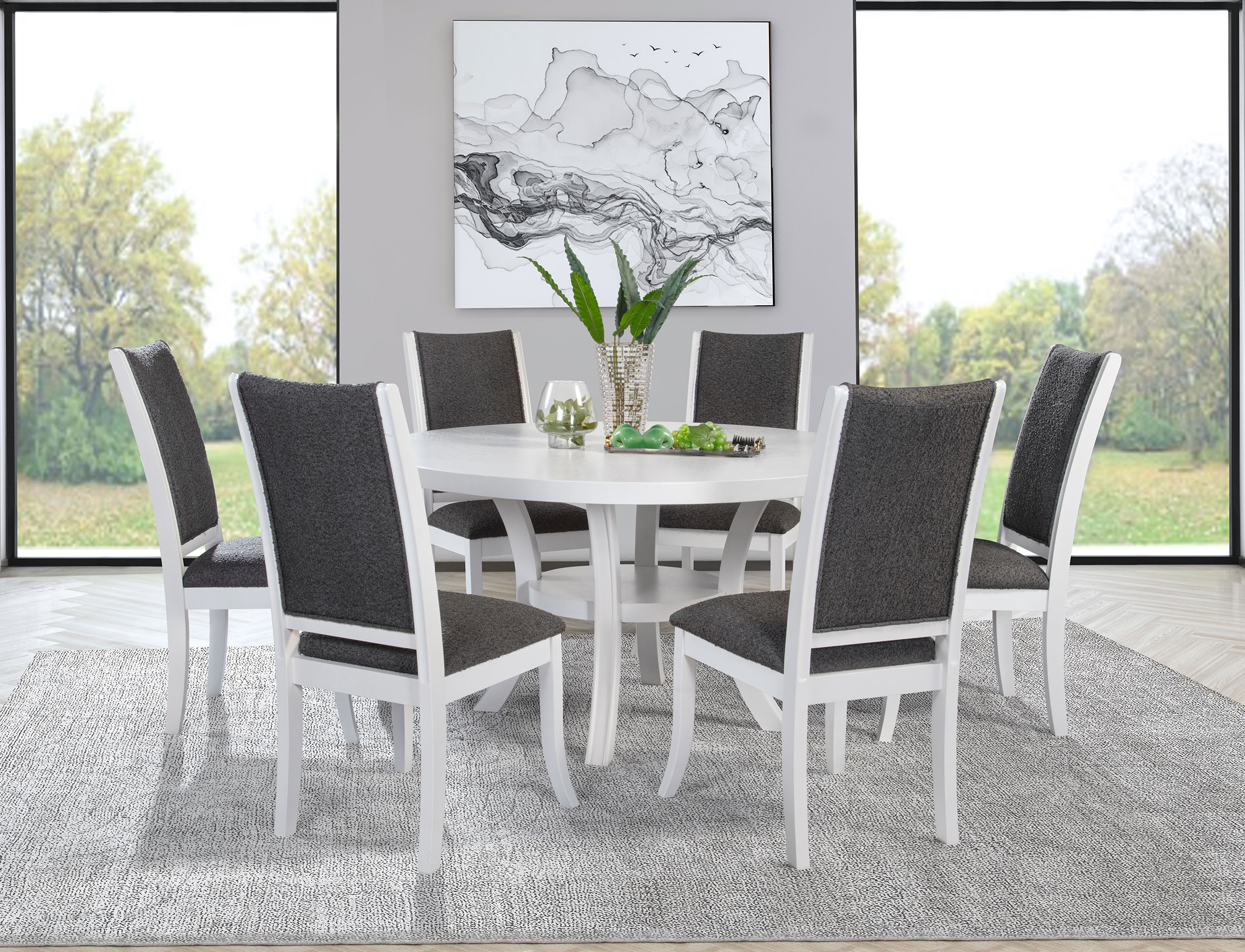 Embrace a modern minimalist presentation with this contemporary dining set. It centers on a roomy round dining table that seats four to six, with flared legs and a round shelf that adds stability and decorative potential. The set adds side chairs, each with a tall, structured silhouette and dark grey upholstery over plush foam cushions. A pearl white finish is clean and fresh, offering plenty of contrast against the grey. The set instills a clean, precise aesthetic, perfect for minimalist or maximalist decor themes.