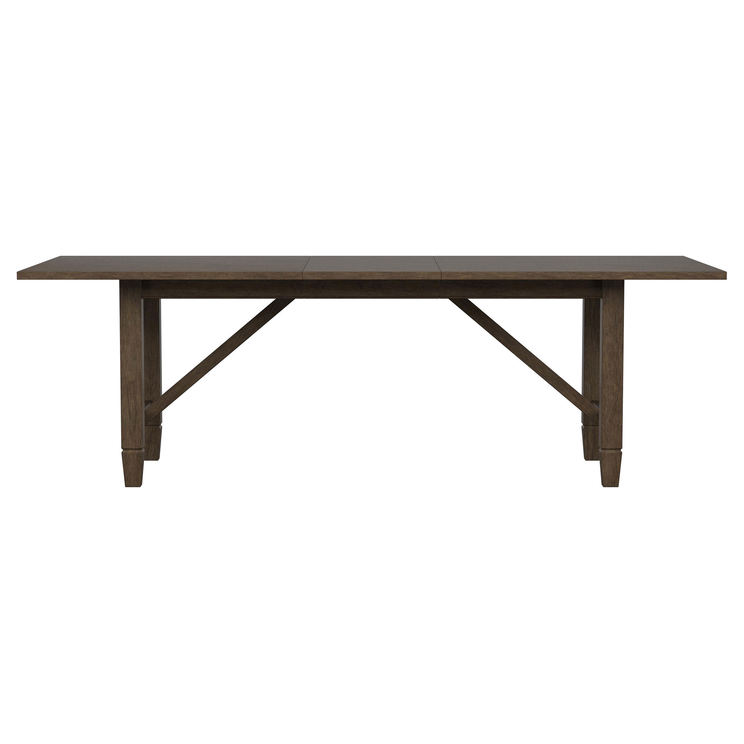- Warm, natural brown wood grain finish pairs with a trestle-style table base