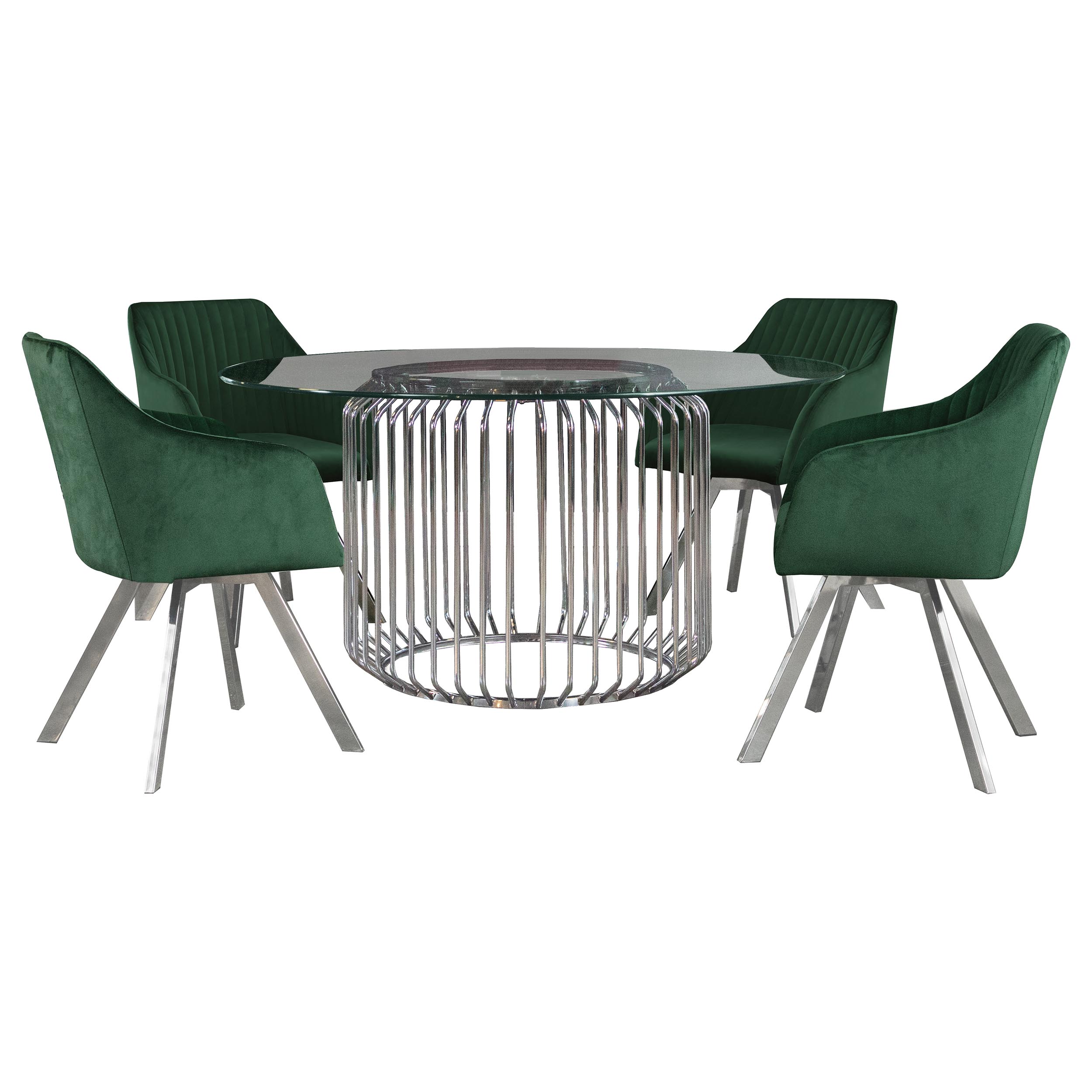 Nestled amidst the verdant embrace of potted palms, the Art Deco-inspired dining table is a modern masterpiece, its cylindrical form enshrouded by gleaming metal rods that whisper tales of Gatsby-esque opulence. A clear, tempered glass top, expansive at 60 inches, floats like a crystalline pond above the polished chrome base, inviting an array of tablescapes to dance upon its surface. Surrounding this sculptural piece, four sumptuous green velvet chairs beckon, their channel tufted backs and swiveling seats echoing the luxury of a bygone era, yet firmly rooted in contemporary comfort. The table and chairs, a marriage of retro flair and modern lines, stand as a stunning focal point, inviting guests to linger over shared meals and conversations that sparkle as brightly as the chrome finishes that bind them.