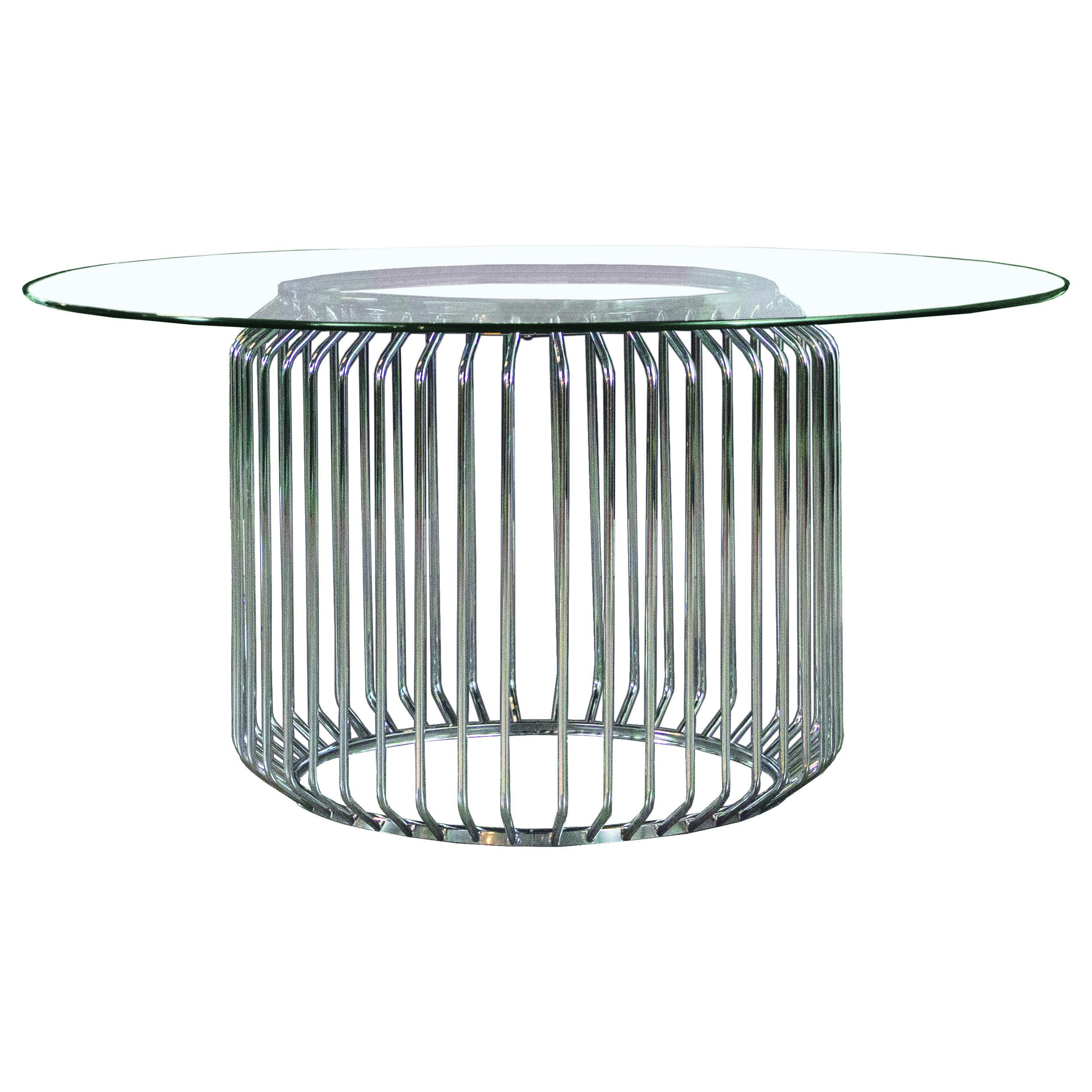 • Table with 60″ clear tempered glass top and cylindrical cage-like metal base in polished chrome