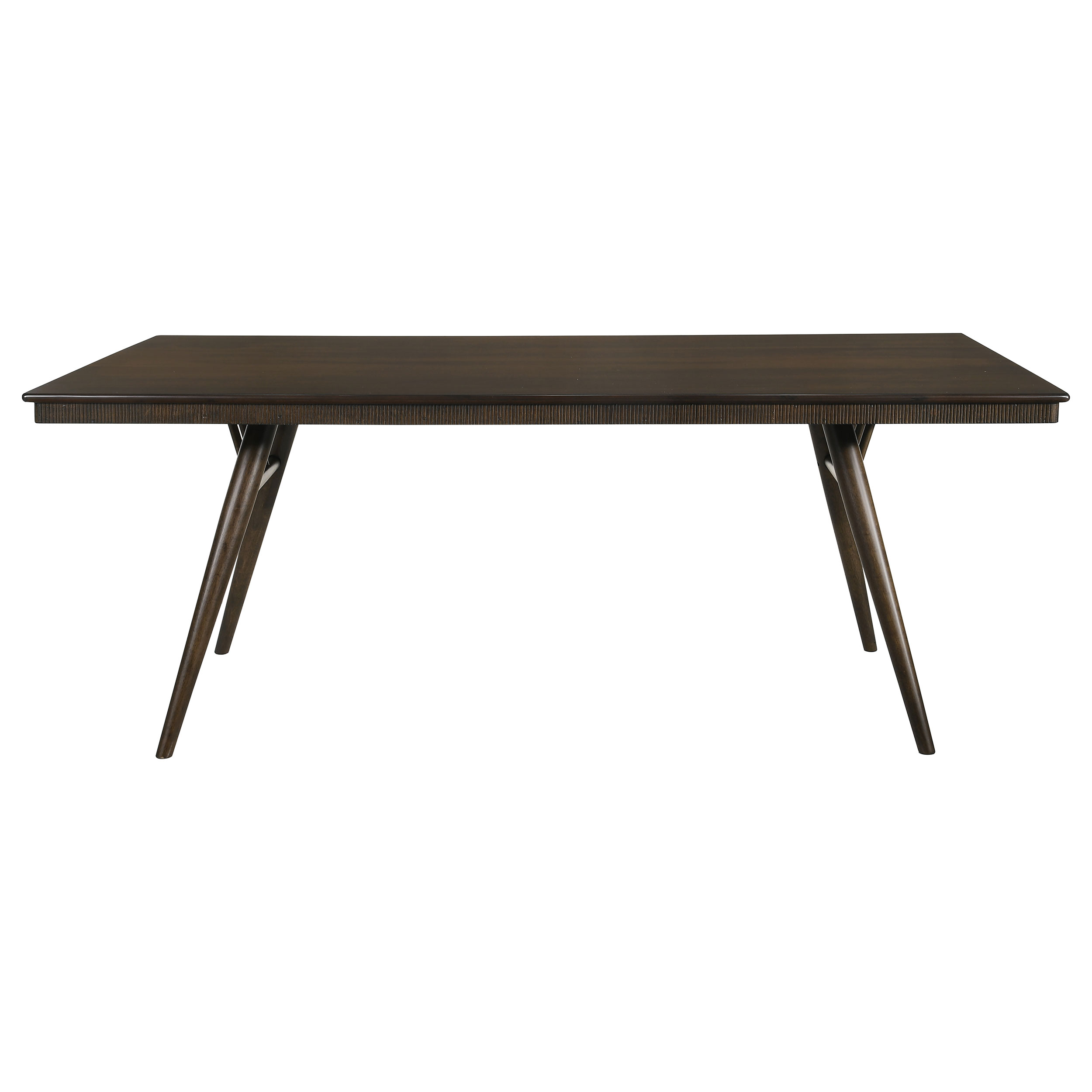 Dress up your modern dining room with this retro-inspired dining table set. Dine along the spacious rectangular table top, accented with fluted apron details and a bullnose edge for a touch of texture. Flared legs extend outward in dramatic fashion with a side brace between them. Designed in a gorgeous dark walnut finish, this dining table set offers a rich color palette for discerning tastes in home decor. A set of matching side chairs complete this dining room table package, each with an elegantly contoured backrest, padded on each side, and a padded seat cushion, all of which are upholstered in a soft dark grey fabric for elevated dining experiences.