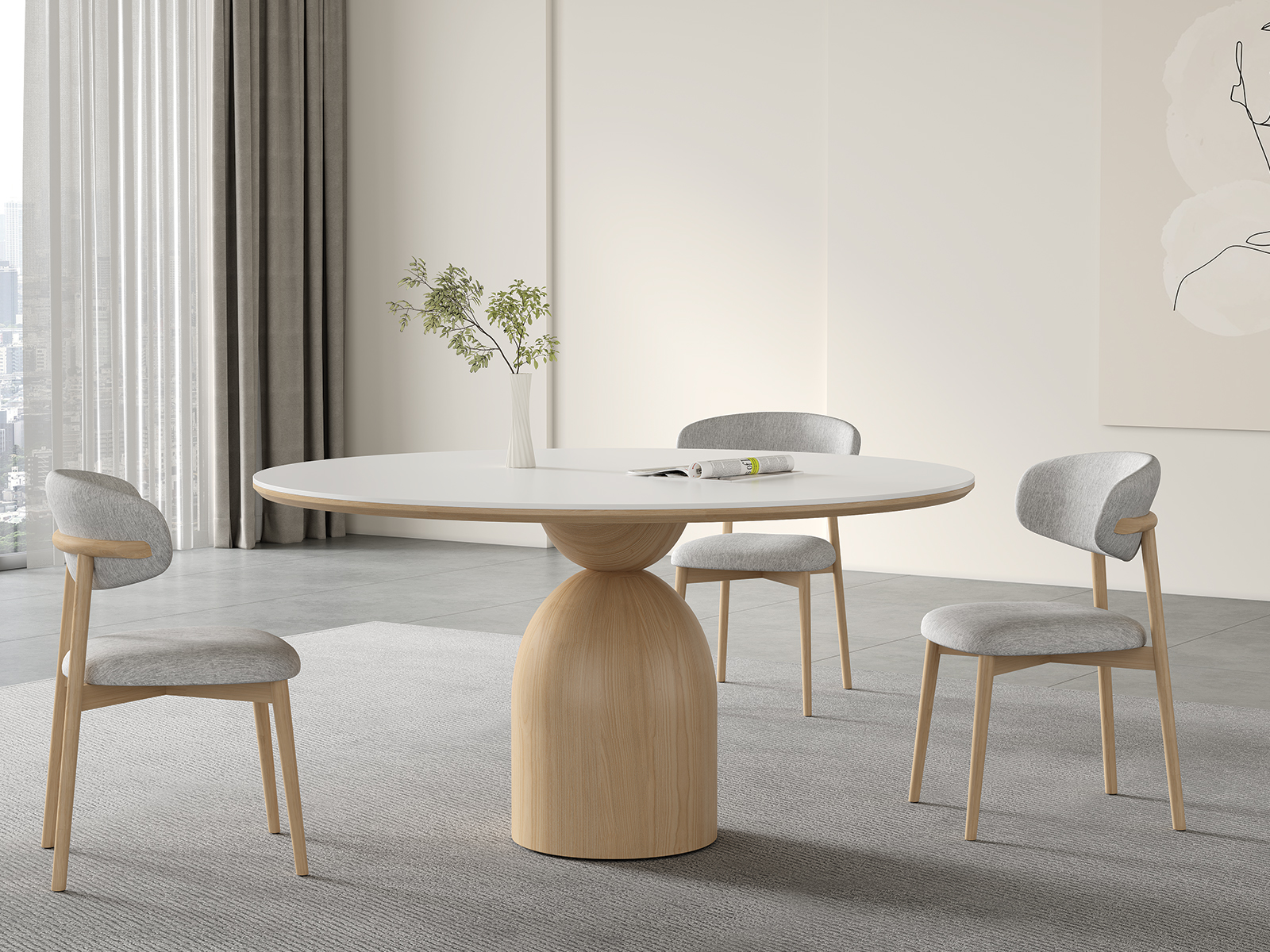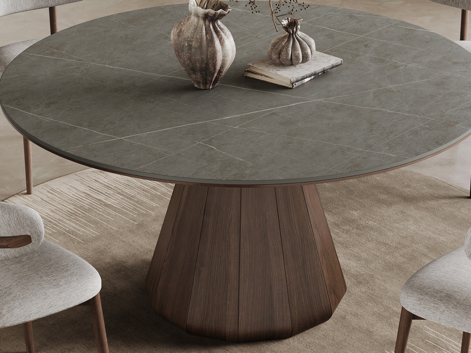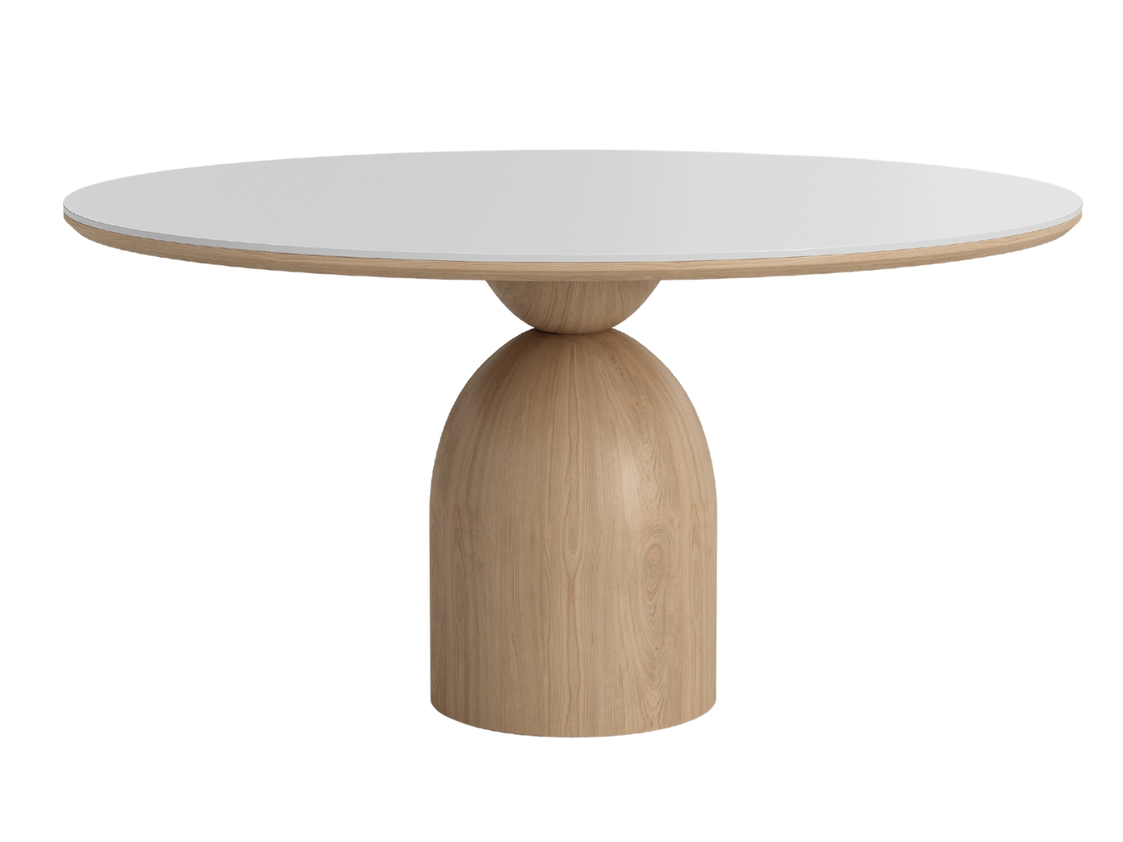 - Andrea 53 in round dining table with white-oak base and white ceramic top.