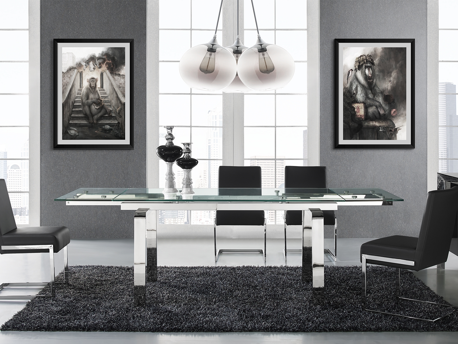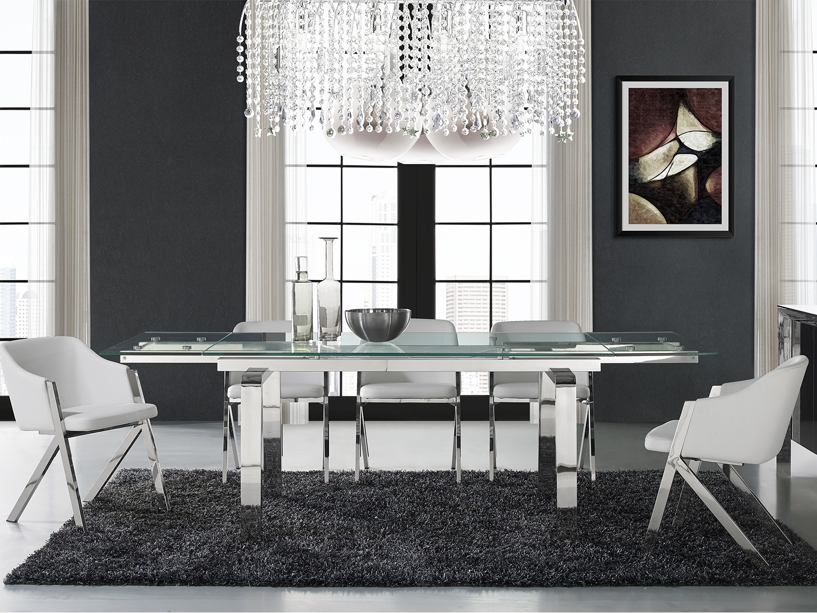 The Casabianca Home Cloud manual dining table base and clear top offers a blend of adaptable style and comfort boasting a modern design that seamlessly complements your dining room decor. This CLOUD manual dining table extends from 63″ to 86.5″ providing ample space for 6 – 8 seats. Our Casabianca Home Cloud extendable dining table is manufactured using stainless steel. Quality that will last for many years to come and is backed by our 1 Year limited warranty against manufacturer defects. Size: 63″ W x 36″ D x 30″ H ( Ext: 63″ – 86.5″ W )