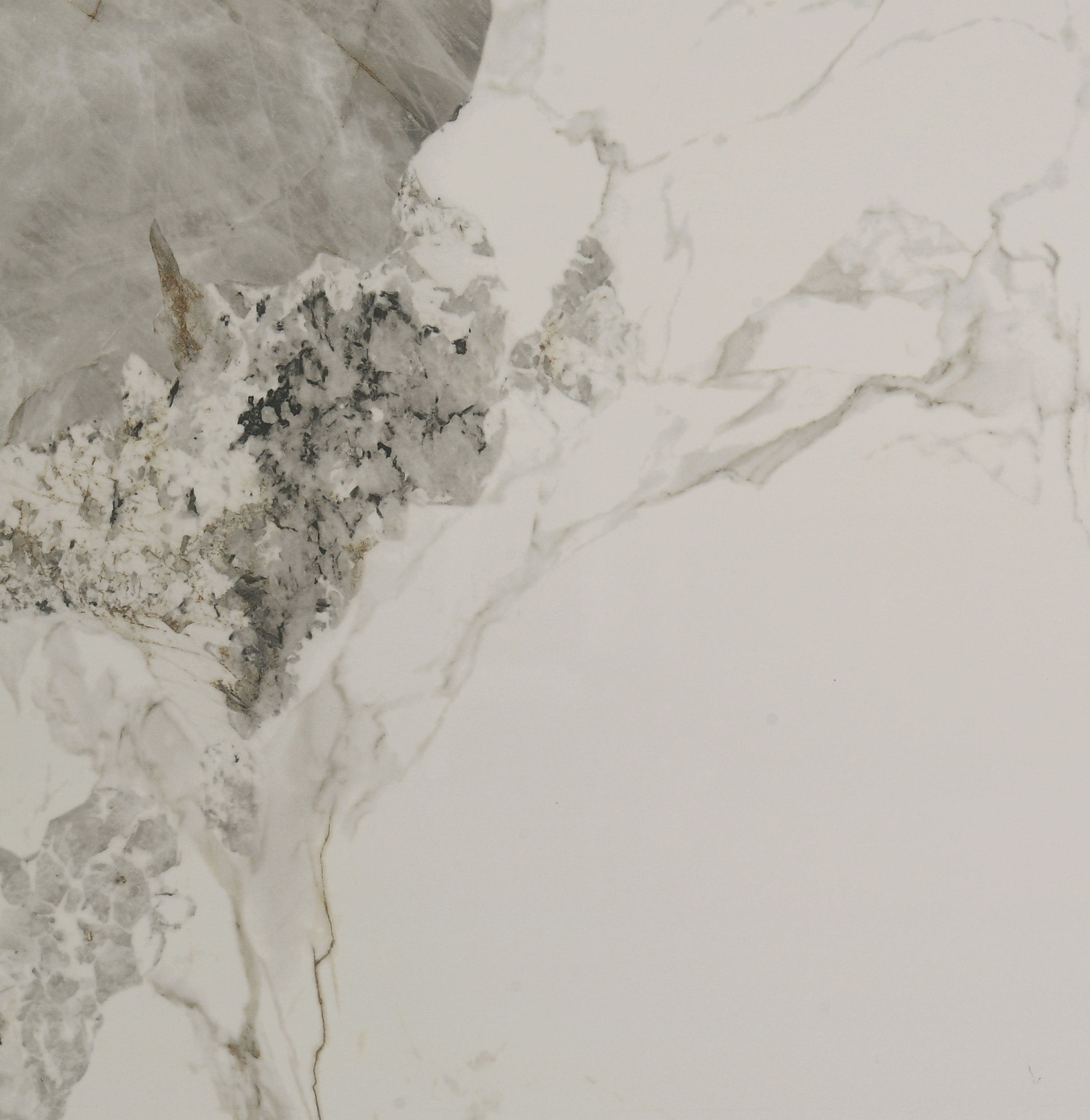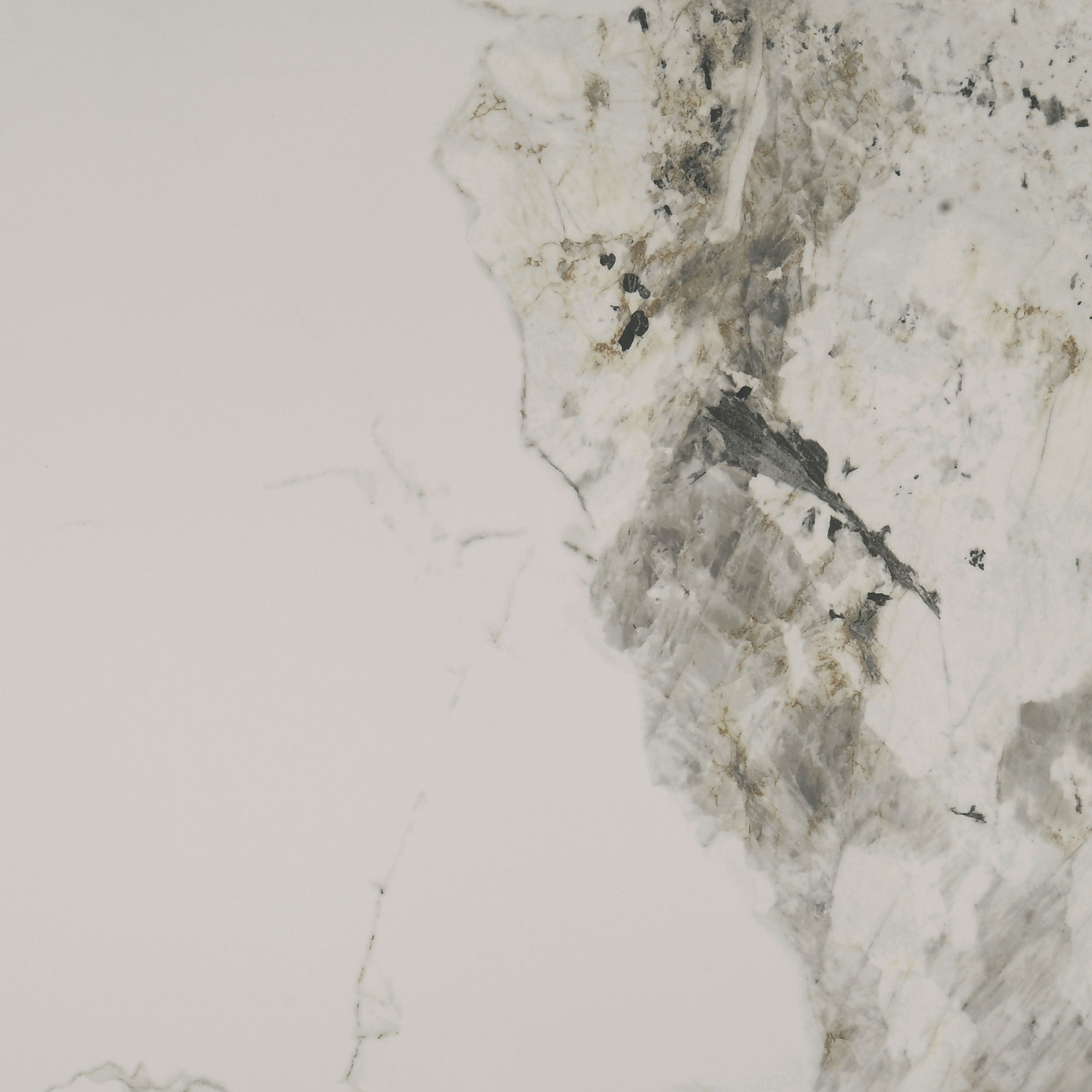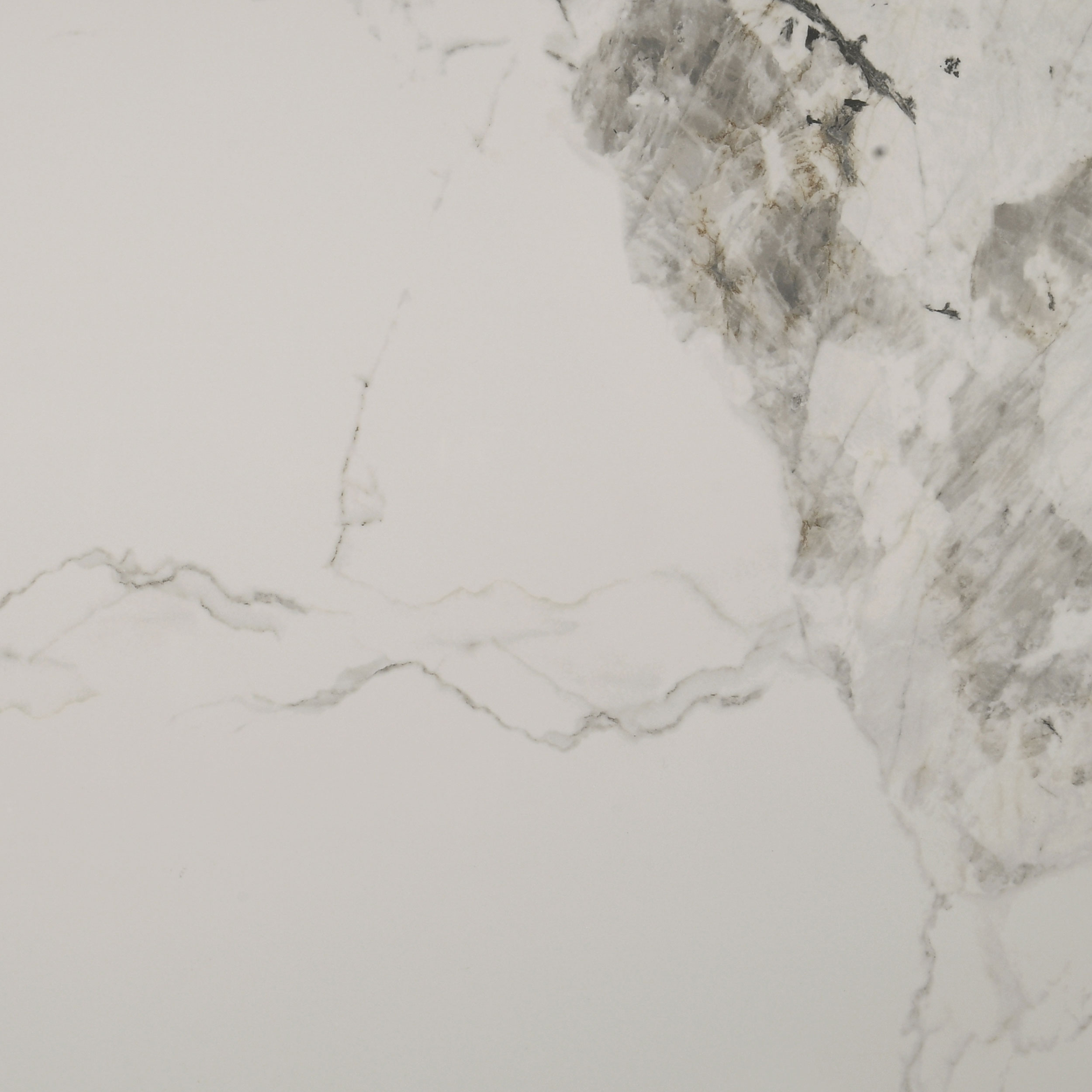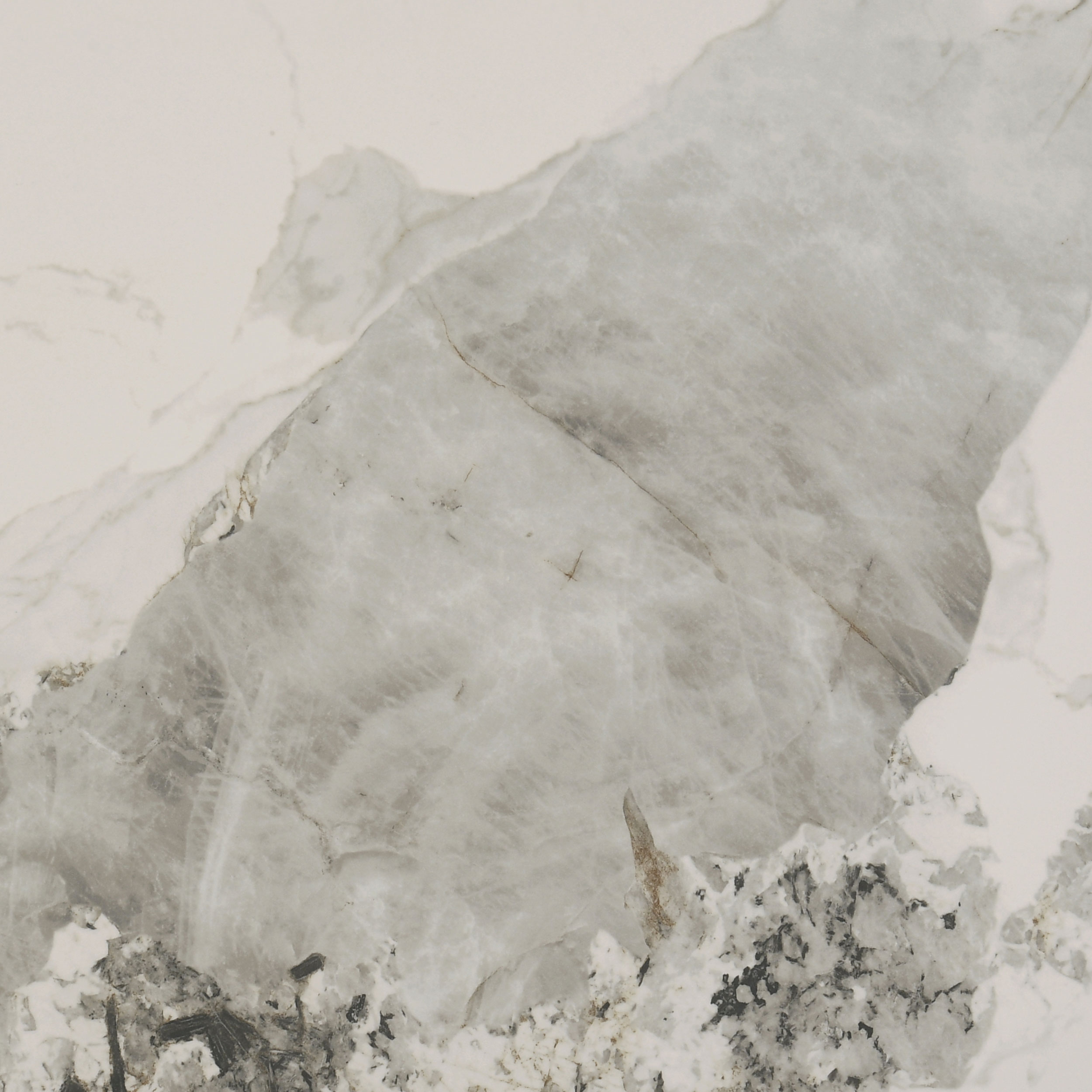 - Recessed ceramic surface features marbled tones of off white, gray, and amber brown