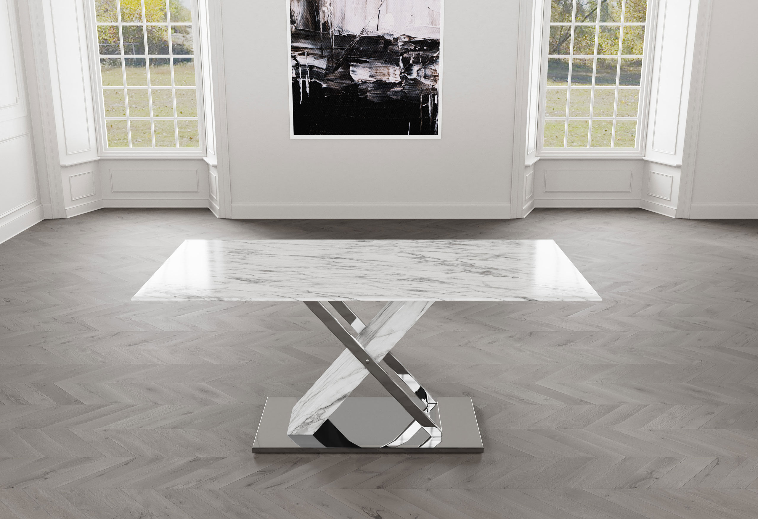 Get all the look of elegant Carrara marble with this stunning yet practical glass-top dining table. Design elements include an x-base design with polished stainless steel accents. This table offers plenty of space for all of your entertaining needs.