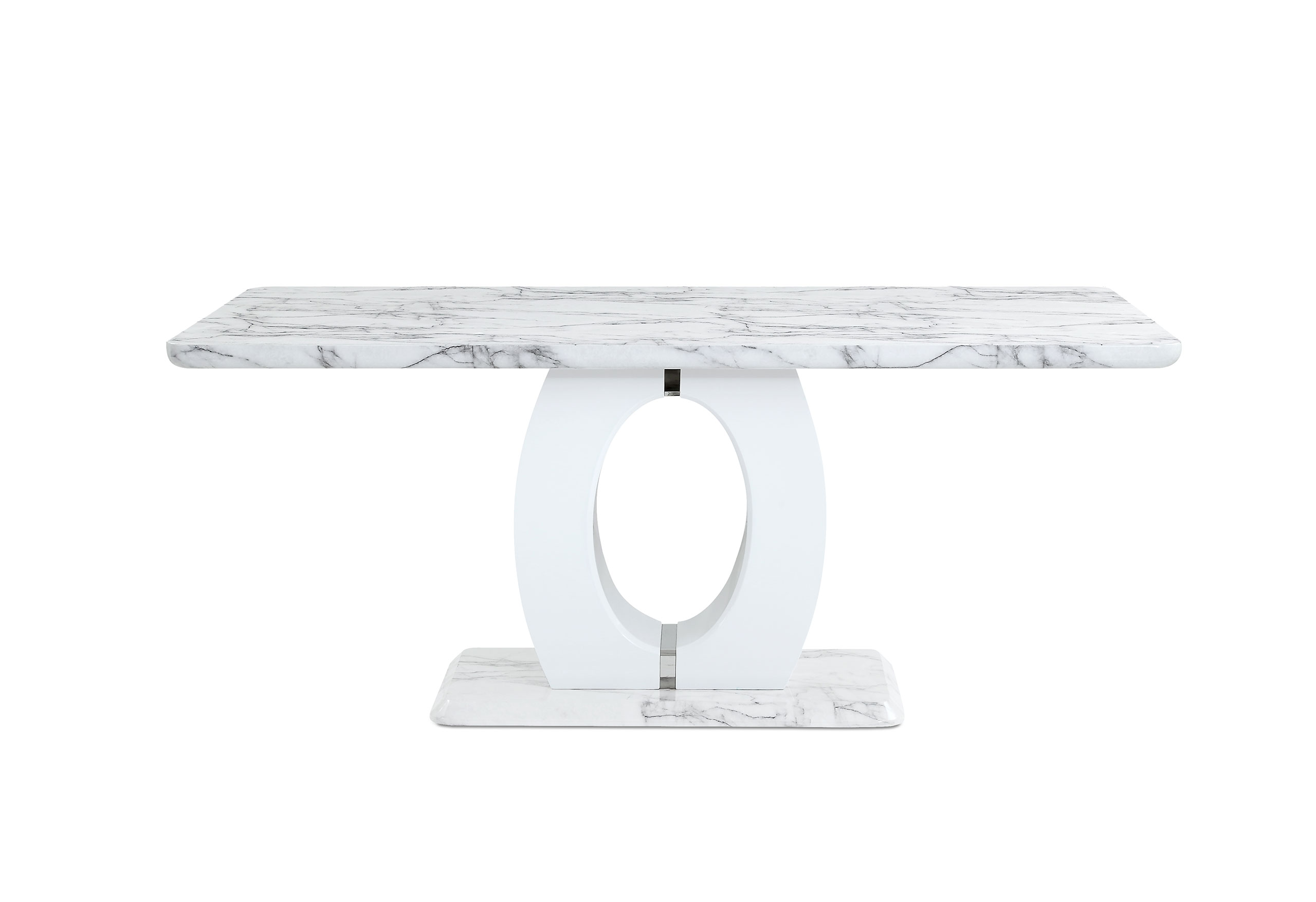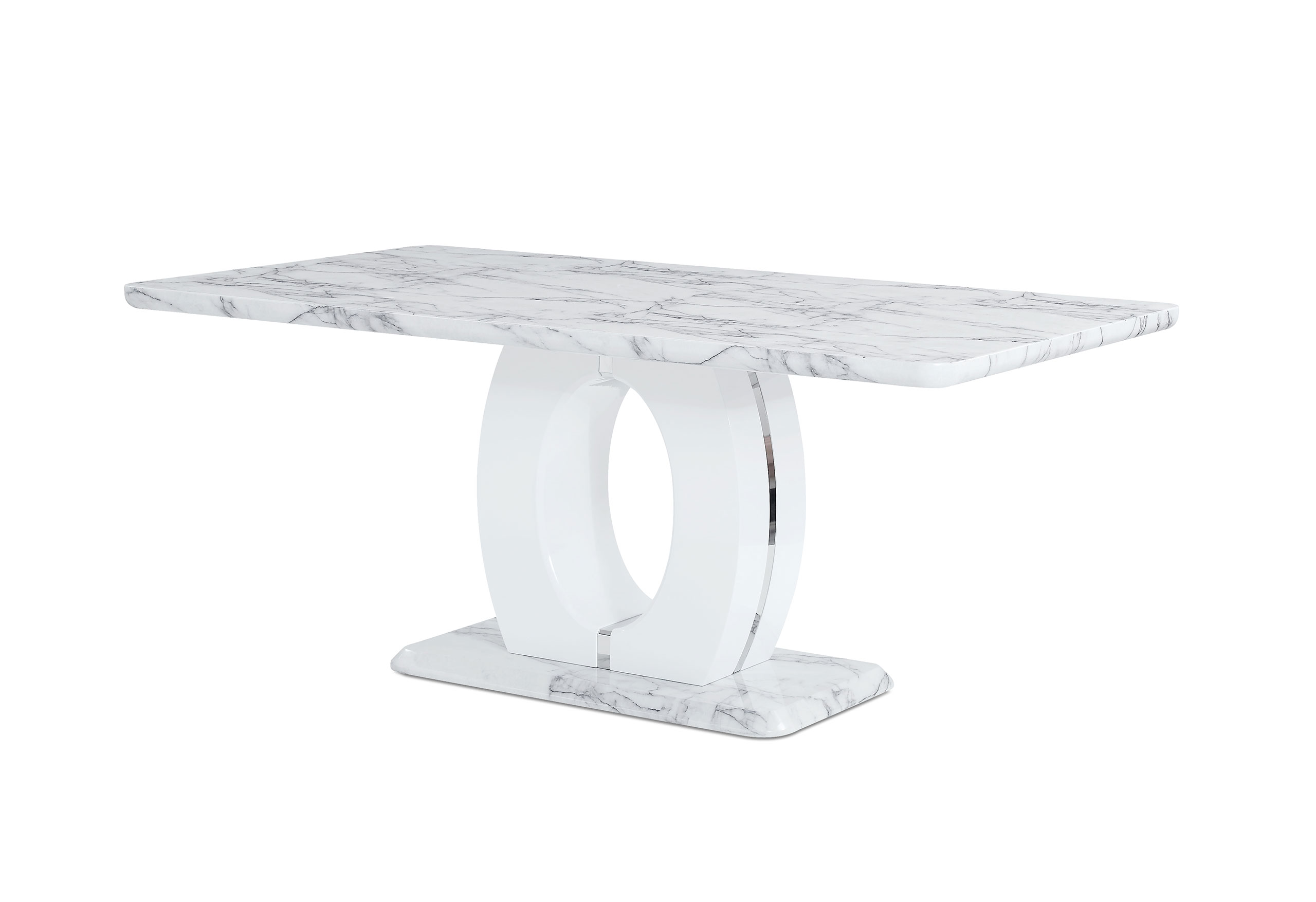 Dining rooms are often the most popular areas of a home and this classy contemporary dining table from Global Furniture shows why. This charming table includes a marble inspired top and base, Oval design style and chrome banding accents to create a warm and appealing entertainment setting.