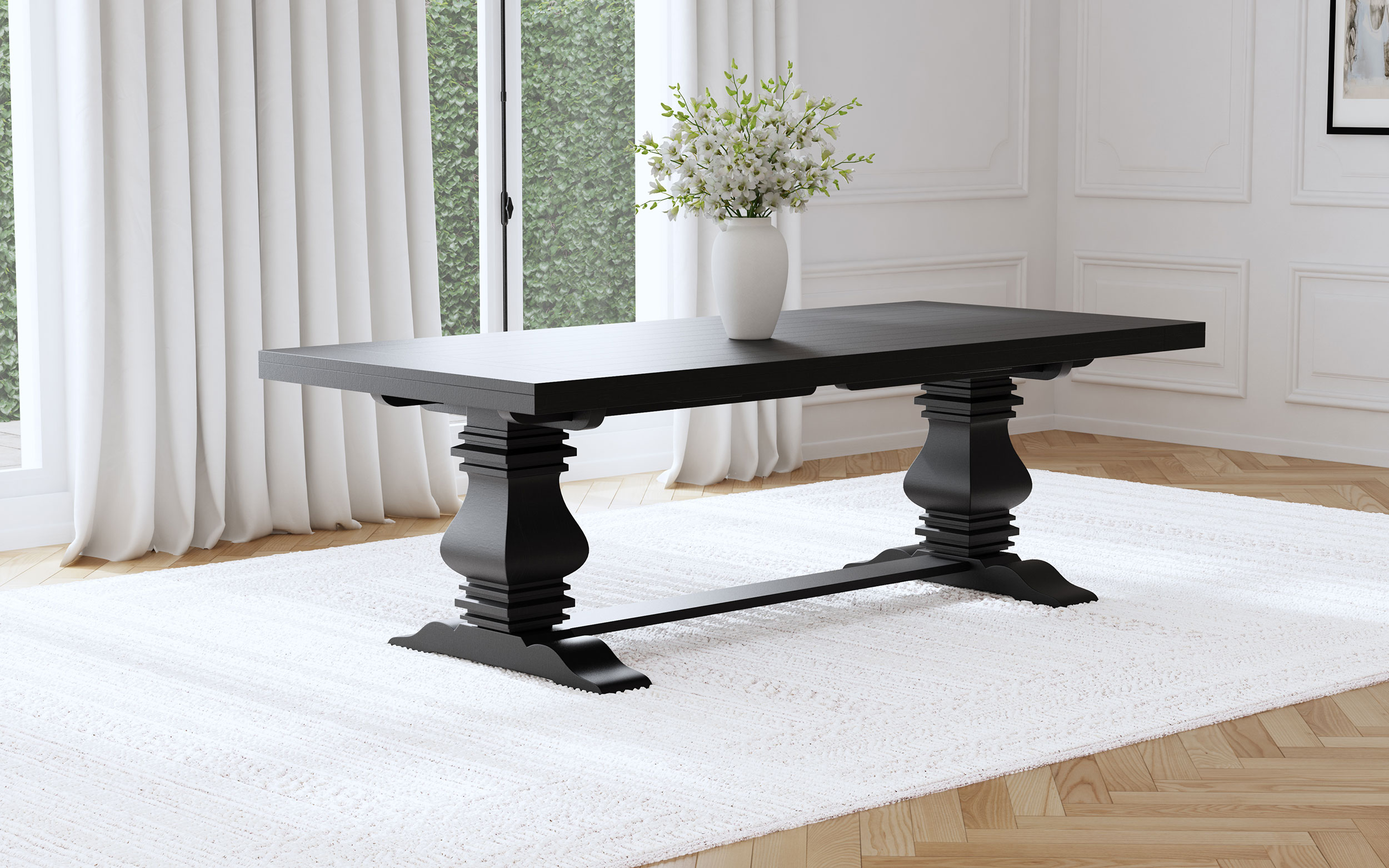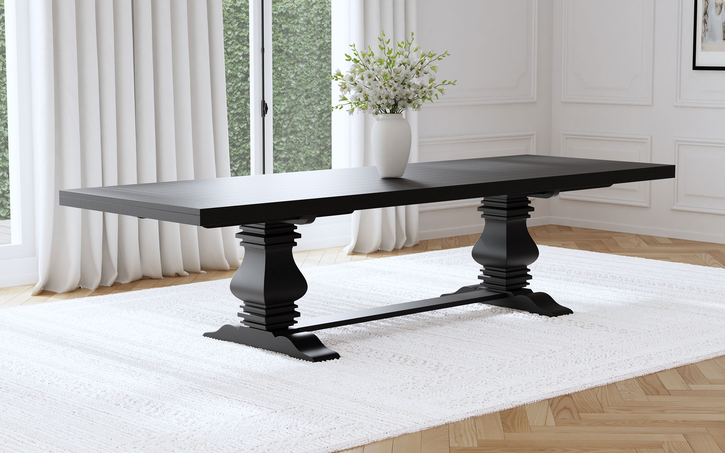 - Rectangular dining table with a sculpted double pedestal trestle base