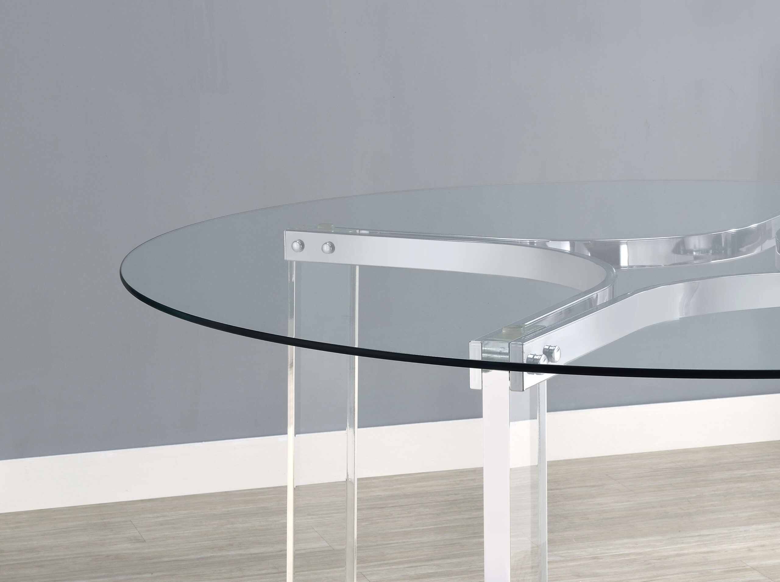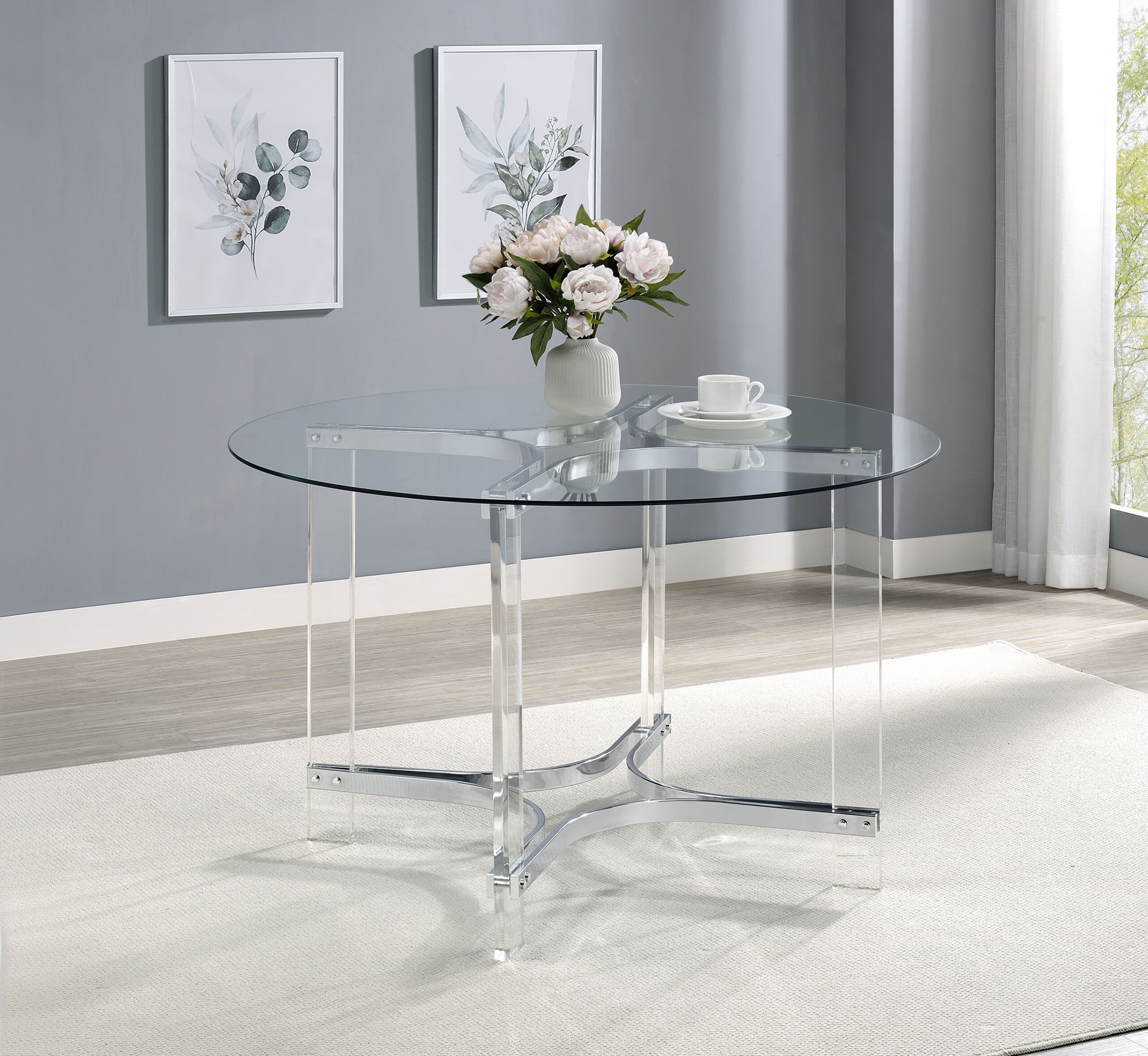 Center your dining experience on a chic, modern round dining table with sculptural appeal. It boasts four straight clear acrylic legs with four-point star bases that create incredible stability. The gleaming chrome finish stands out, adding artistry to your kitchen or dining room. The table is topped with a round of clear glass, adding to its airy ambiance. This contemporary table comfortably seats four, perfect for a breakfast nook or compact dining room.