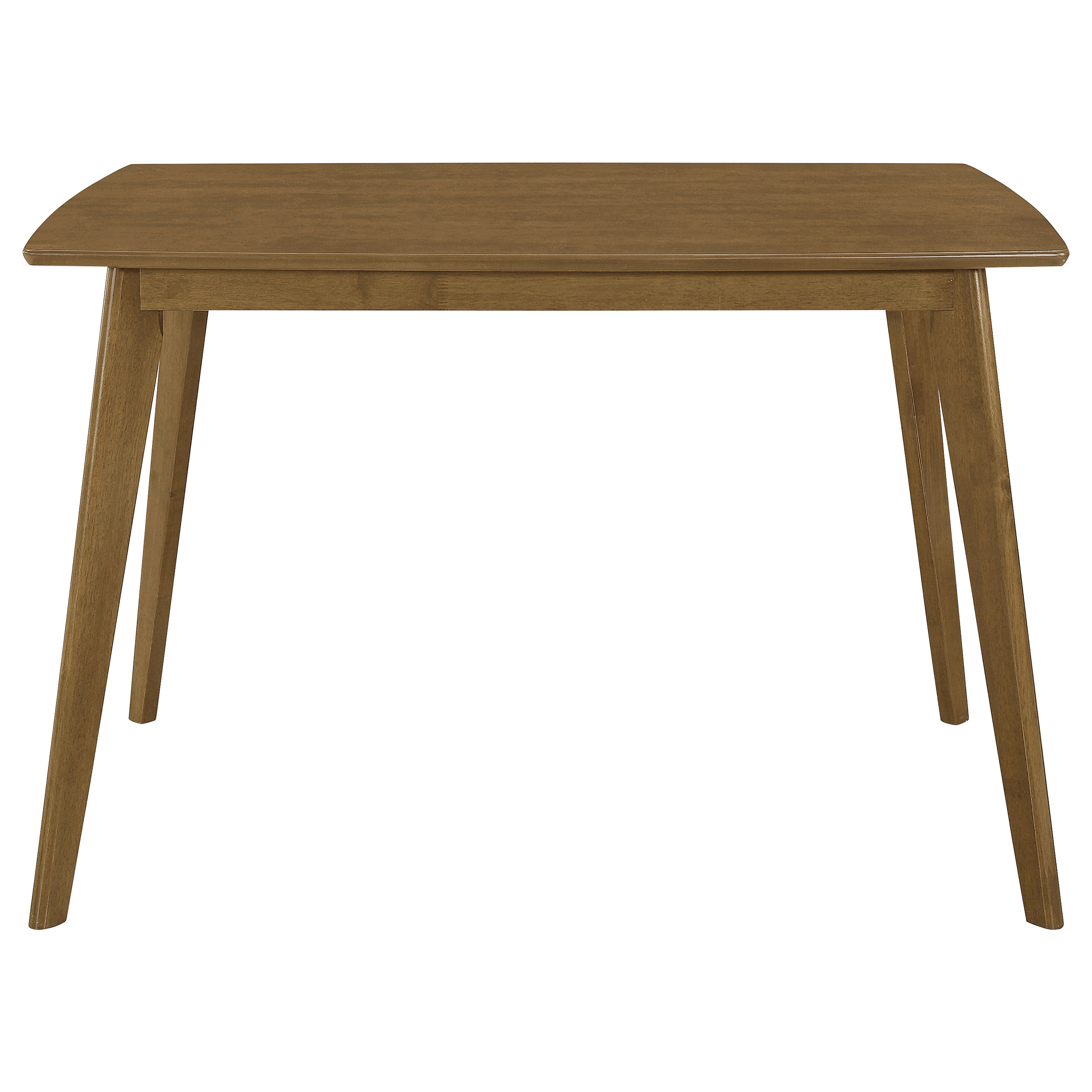 Anchoring the Kersey Collection, this solid wood dining table imparts a retro feel. Rectangular top and angled legs give it a resolute profile. Finished in chestnut that goes well by a sunlit window overlooking a garden. Crafted for functionality yet appreciated for its adaptability to your one-of-a-kind home decor. Choice of two chair styles to customize the look.