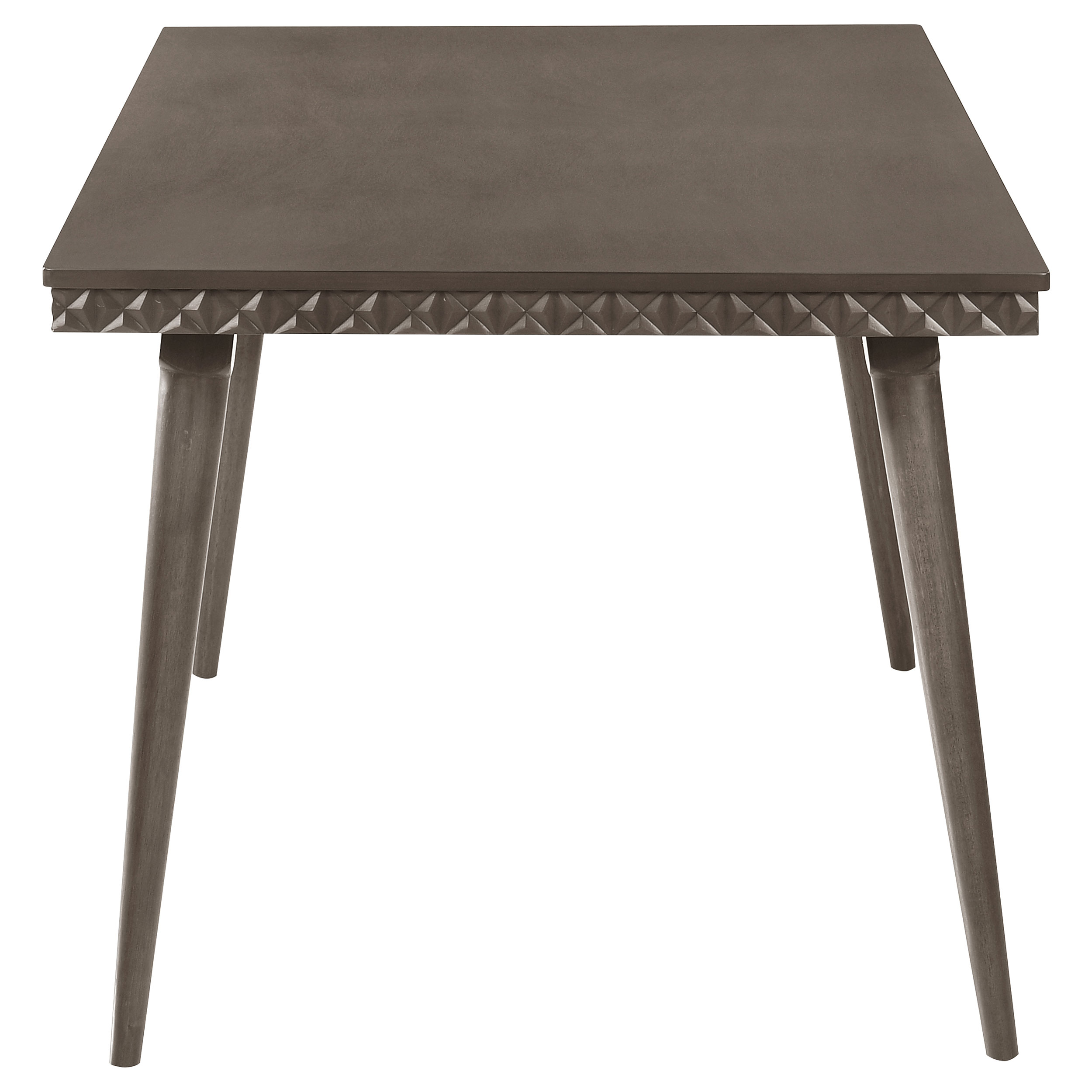 Introduce modern elegance to your dining room with this stunning 59-inch dining table. Its distinctive design features intricate detailing along the apron, adding a textural contrast to the smooth tabletop. Constructed with a blend of solid wood, engineered wood, embossed mdf, and okume veneer, this table ensures both durability and style. The dark brown finish enhances its sleek, sophisticated appearance, making it a focal point in any dining space. Tapered legs add a mid-century touch while maintaining a contemporary appeal, perfect for modern or transitional homes.
