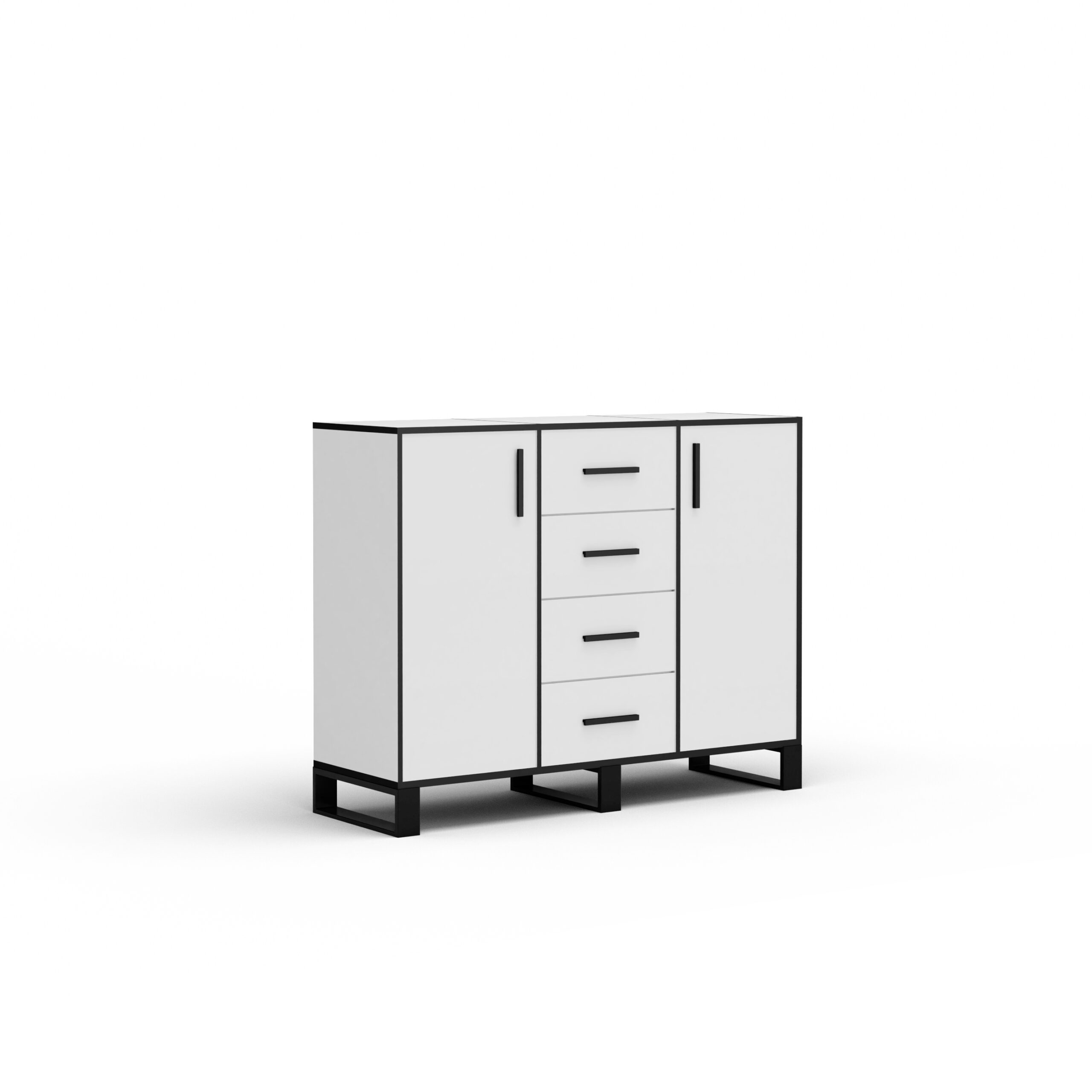 - 4 Pull-out drawers with lifetime-warranted drawer glide that include; chrome finish handles; 2 sheves in each compartment; black accented borders, black metal legs