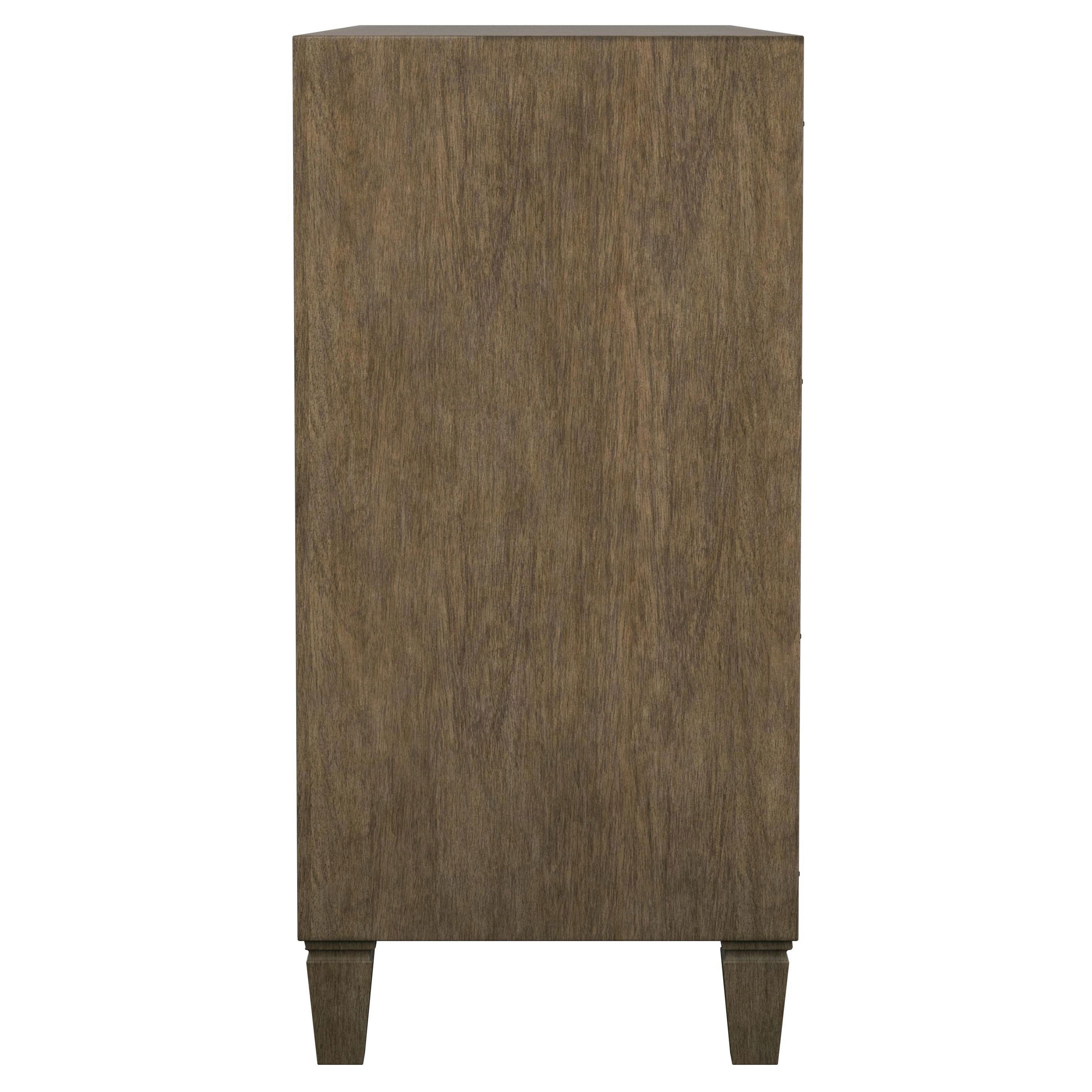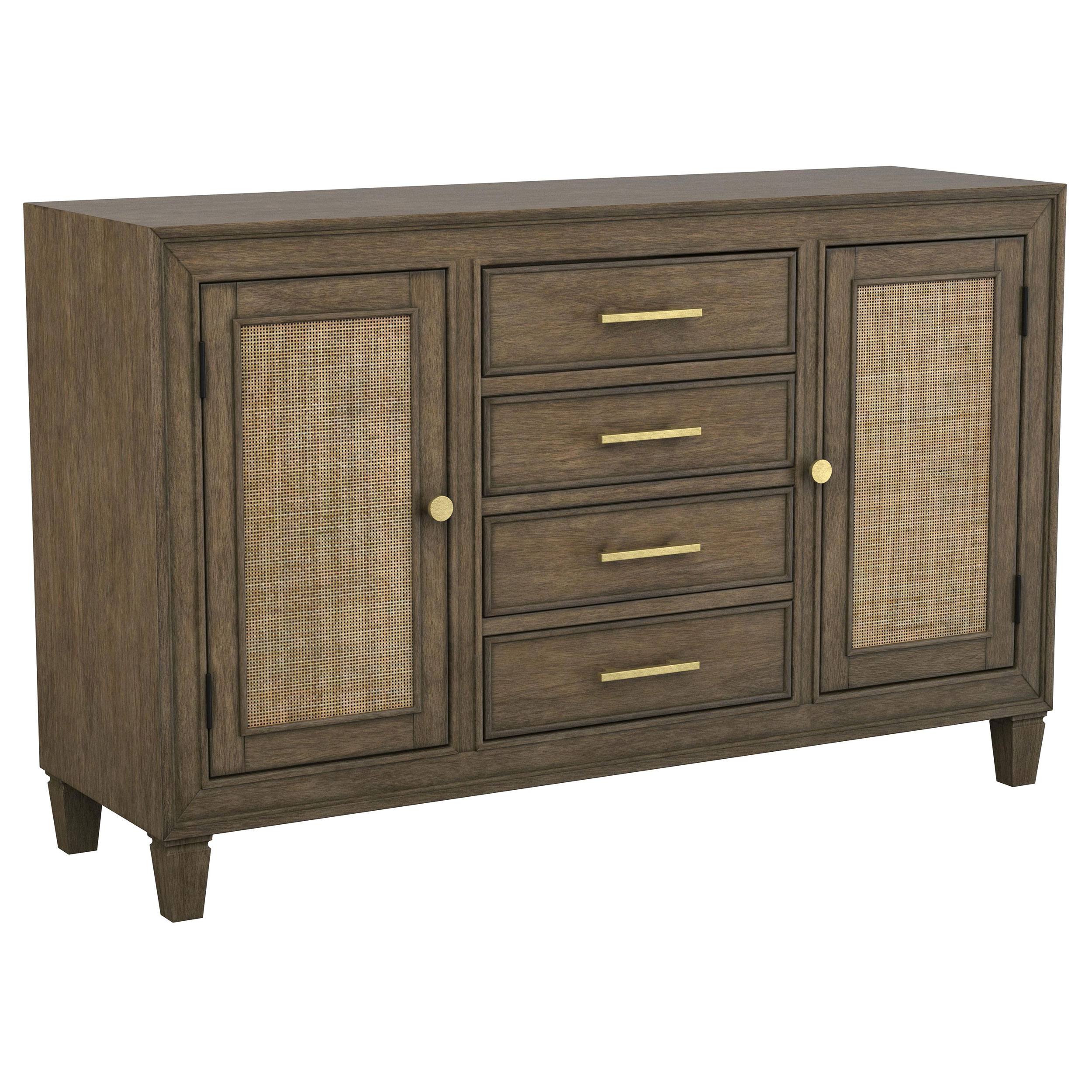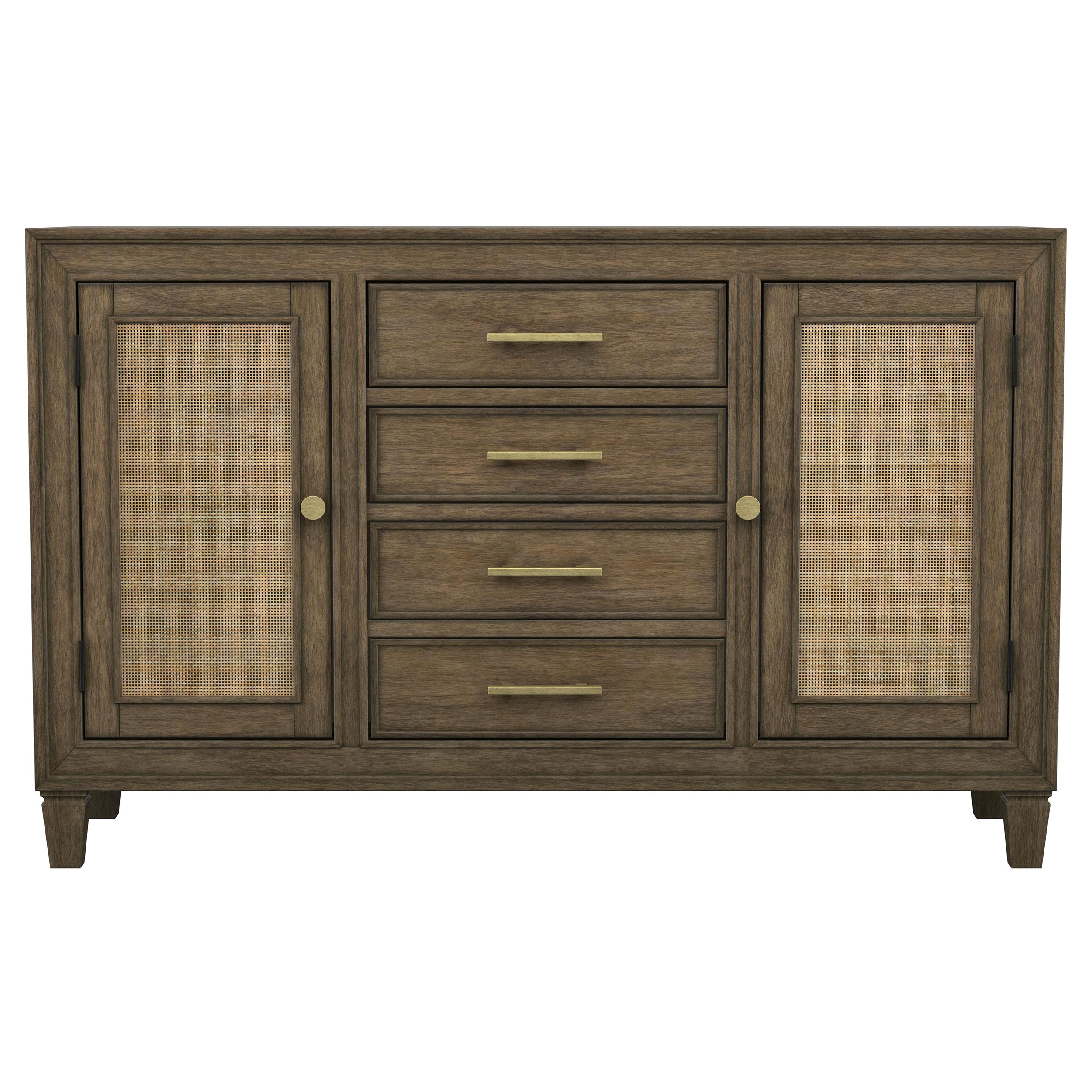 An impressive amount of storage pairs with impeccable style in a modern farmhouse sideboard. Simply charming in your dining room, it boasts a center core of four drawers, with two side cabinets that add a spot for larger items and serve ware. The sideboard is styled in a natural wood finish that’s warm and inviting while each door features a lighter rattan panel, delivering airy ambiance and breezy character. Bar pulls in a warm metallic hue highlight the drawers, while doors feature matching round knobs. Serve delicious buffets on the tabletop, or choose an assortment of decor that adds a personalized touch.