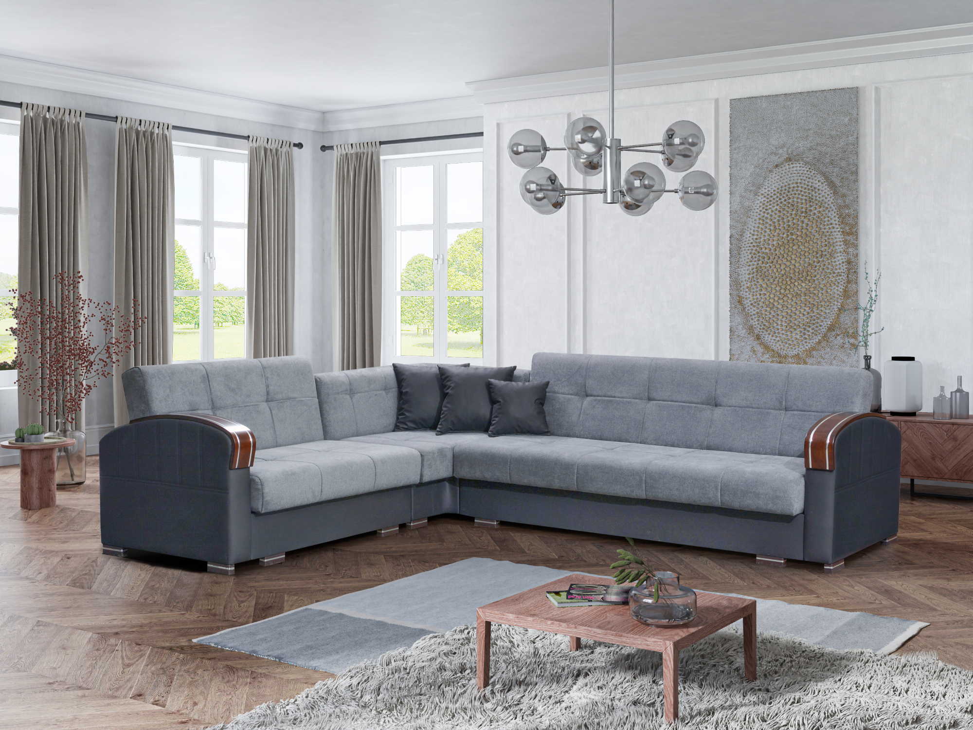 - This modern transitional designed microfiber/microsuede sleeper sectional with foam cushioning, wavy springs and shiney arched wooden armrest provide tremendous aesthetic versatility to be used within virtually any interior décor.