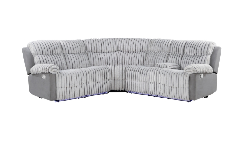 The U6028 Sectional by Global Furniture USA is the epitome of comfort and convenience. This luxurious two tone sectional features manual recline on the two end positions, allowing you to relax in style. The addition of a console with storage and cupholders enhances the functionality of this piece, making it perfect for movie nights or cozy evenings at home. Finished in a light grey corduroy and grey microfiber, this sectional combines elegance with practicality, creating a sophisticated focal point for your living space.