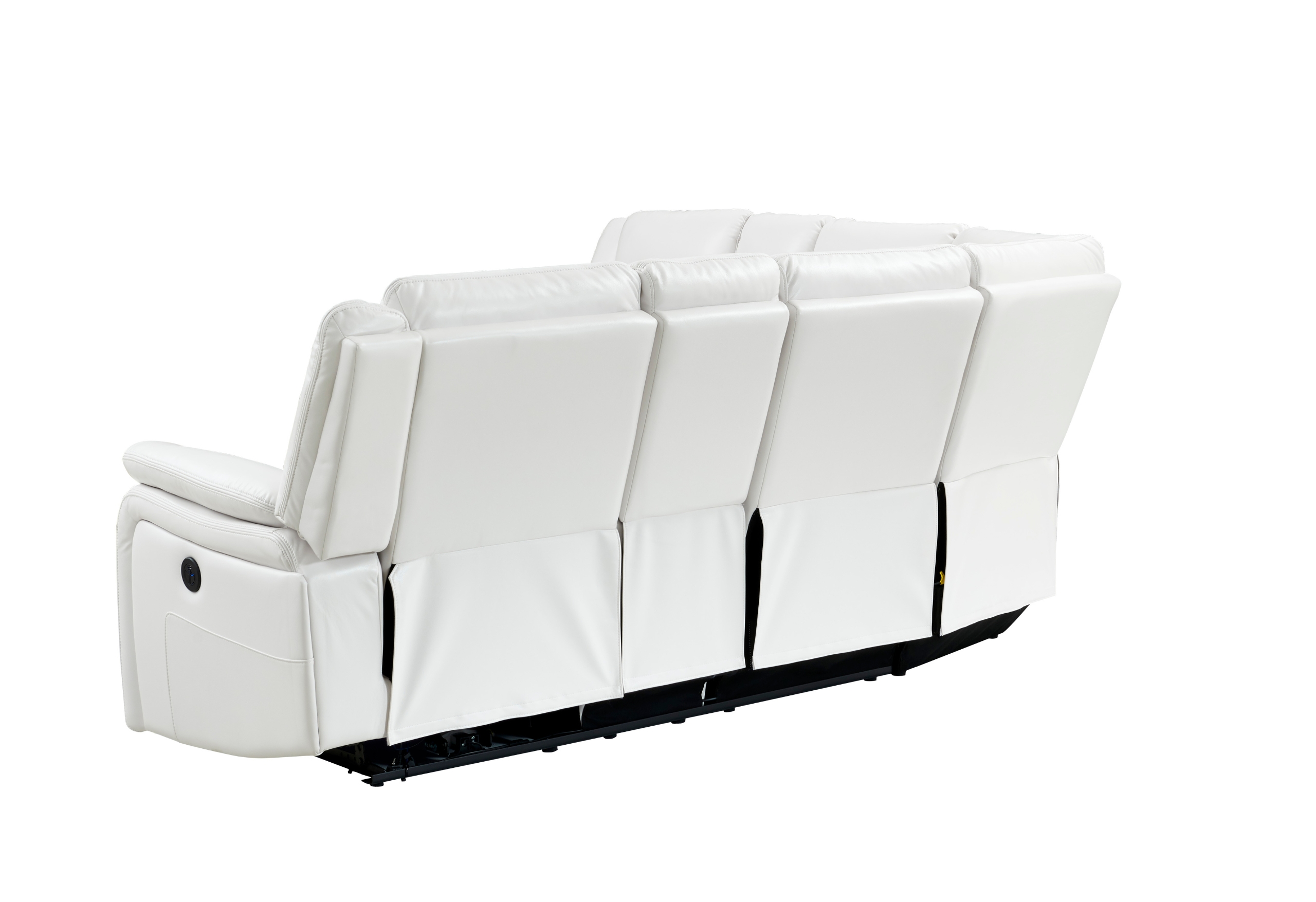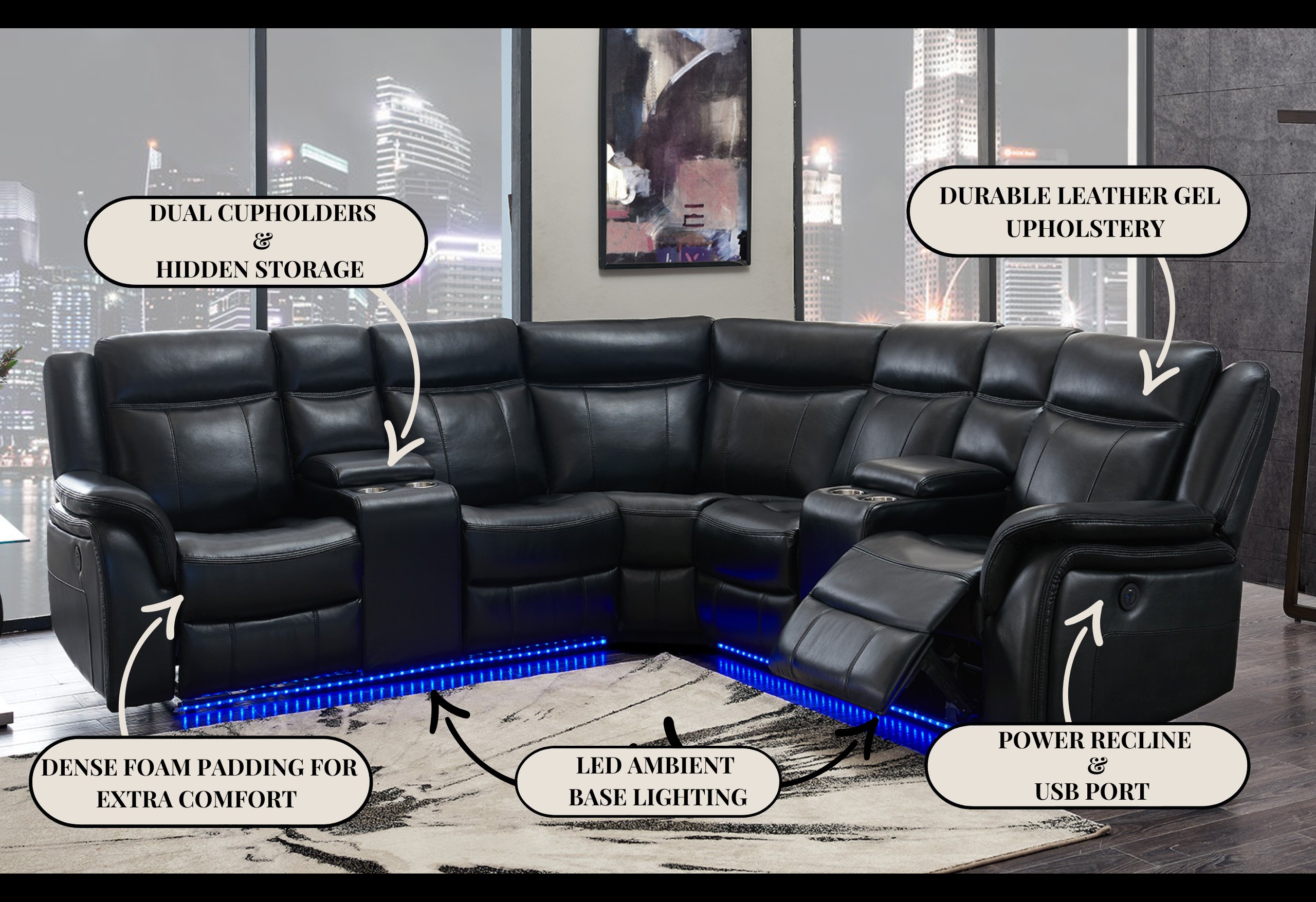 The UM02 Black Sectional by Global Furniture USA is a stunning and comfortable addition to any living room. The sectional is upholstered in black bonded leather and features overstuffed cushions and power recline for maximum comfort. The LED accent lights along the base of the sectional provide a soft and inviting ambiance, perfect for movie nights or entertaining guests. The sectional is expertly crafted with high-quality materials, ensuring durability and longevity. Add this stunning sectional to your living room to enjoy years of comfort and style.