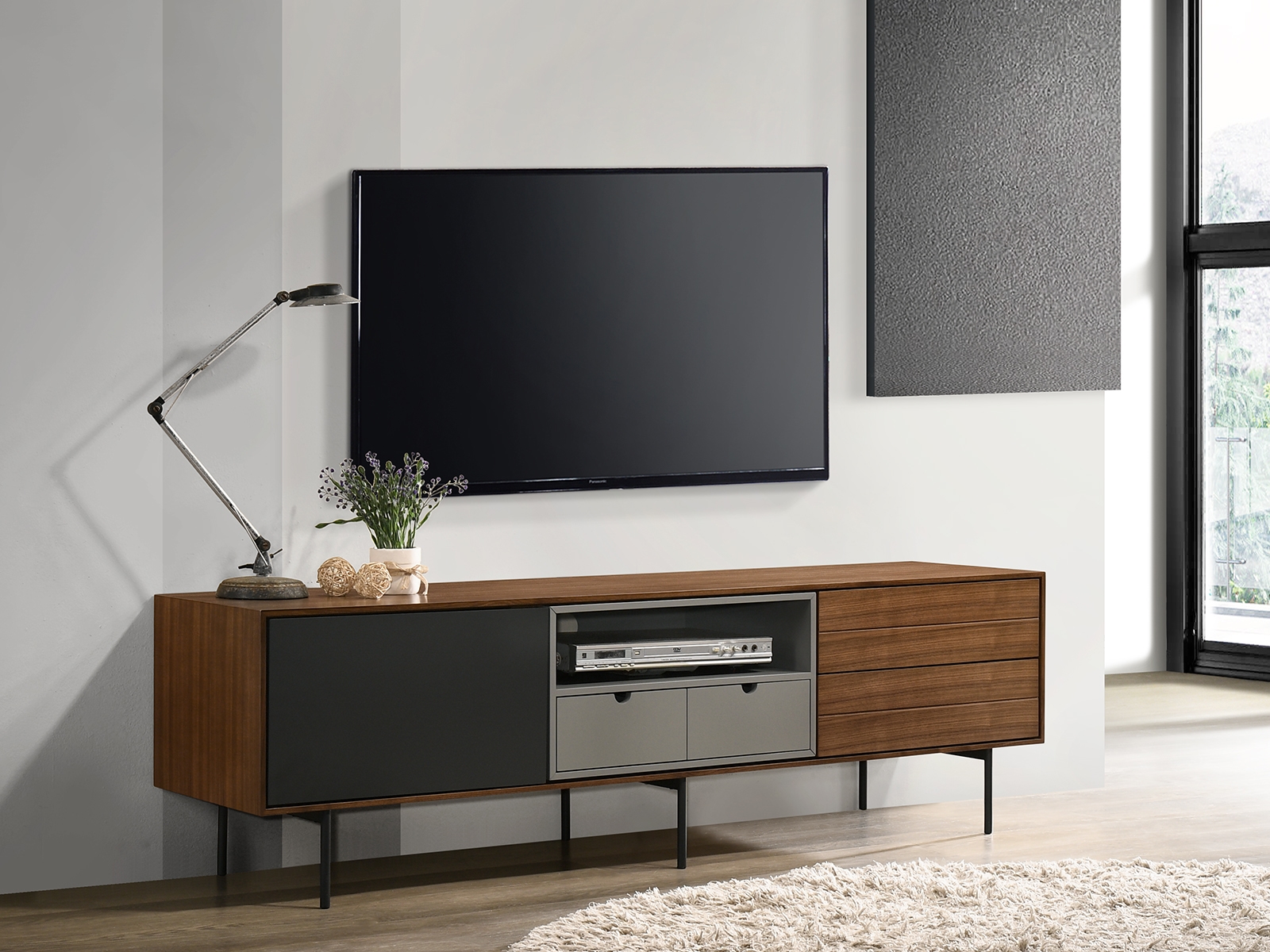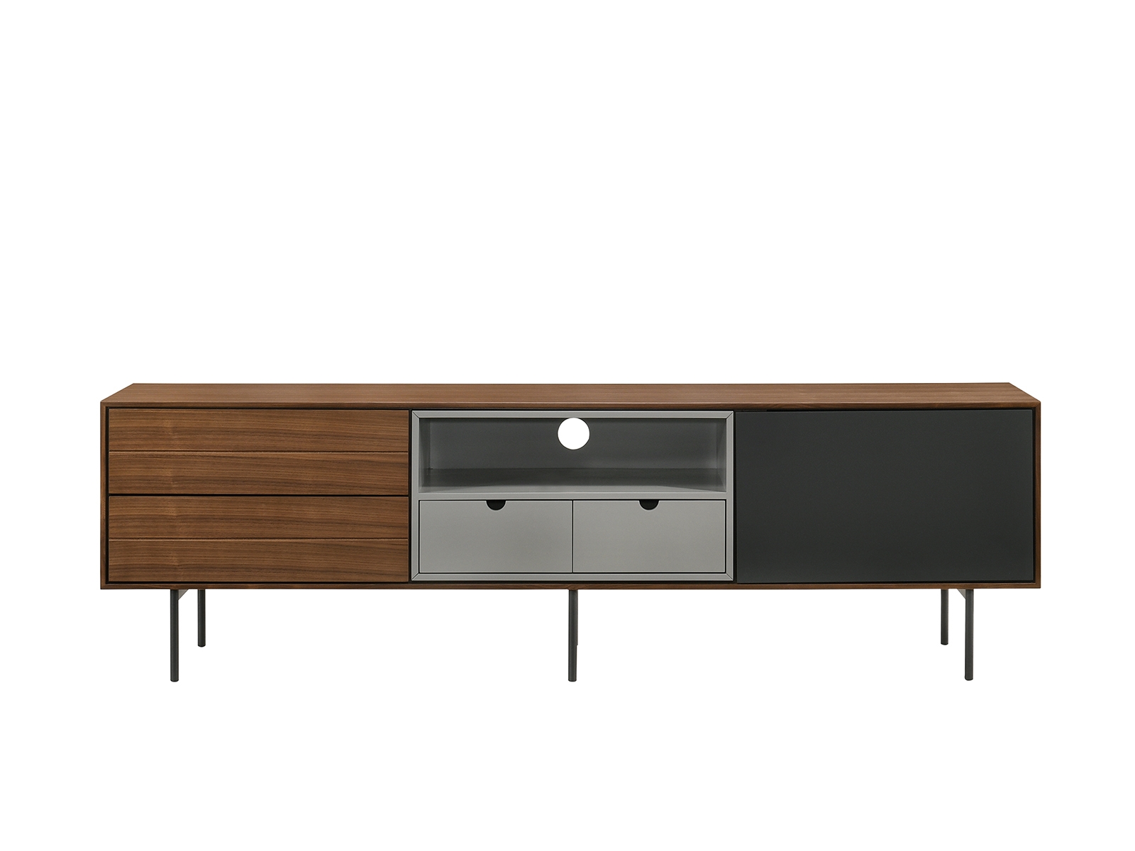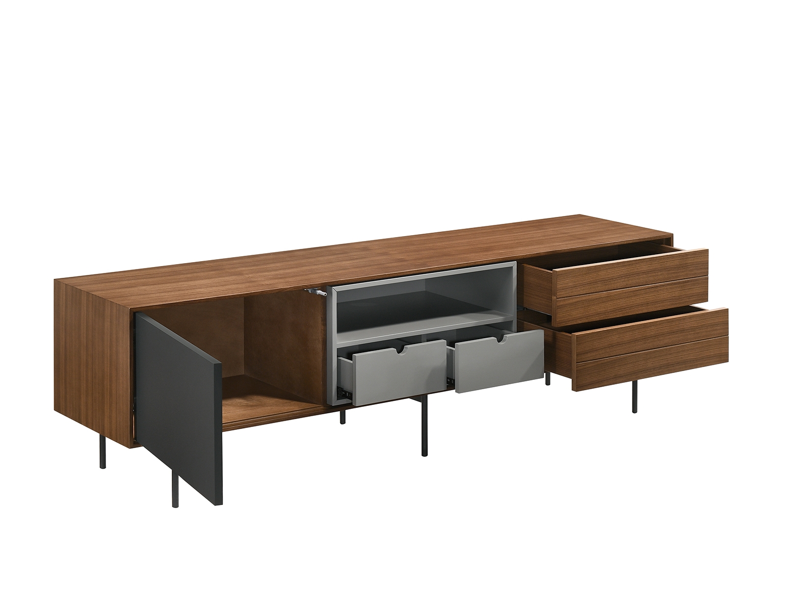 The Casabianca Home Calico entertainment center in walnut veneer with storage offers a blend of adaptable style and comfort boasting a modern design that seamlessly complements your home decor. This Calico entertainment center features four soft close drawers and one cabinet adding elegance with functionality to your space. Our Casabianca Home Calico entertainment center is manufactured using quality materials that will last for many years to come and is backed by our 1 Year limited warranty against manufacturer defects. Size: 66″ W x 15″ D x 20″ H