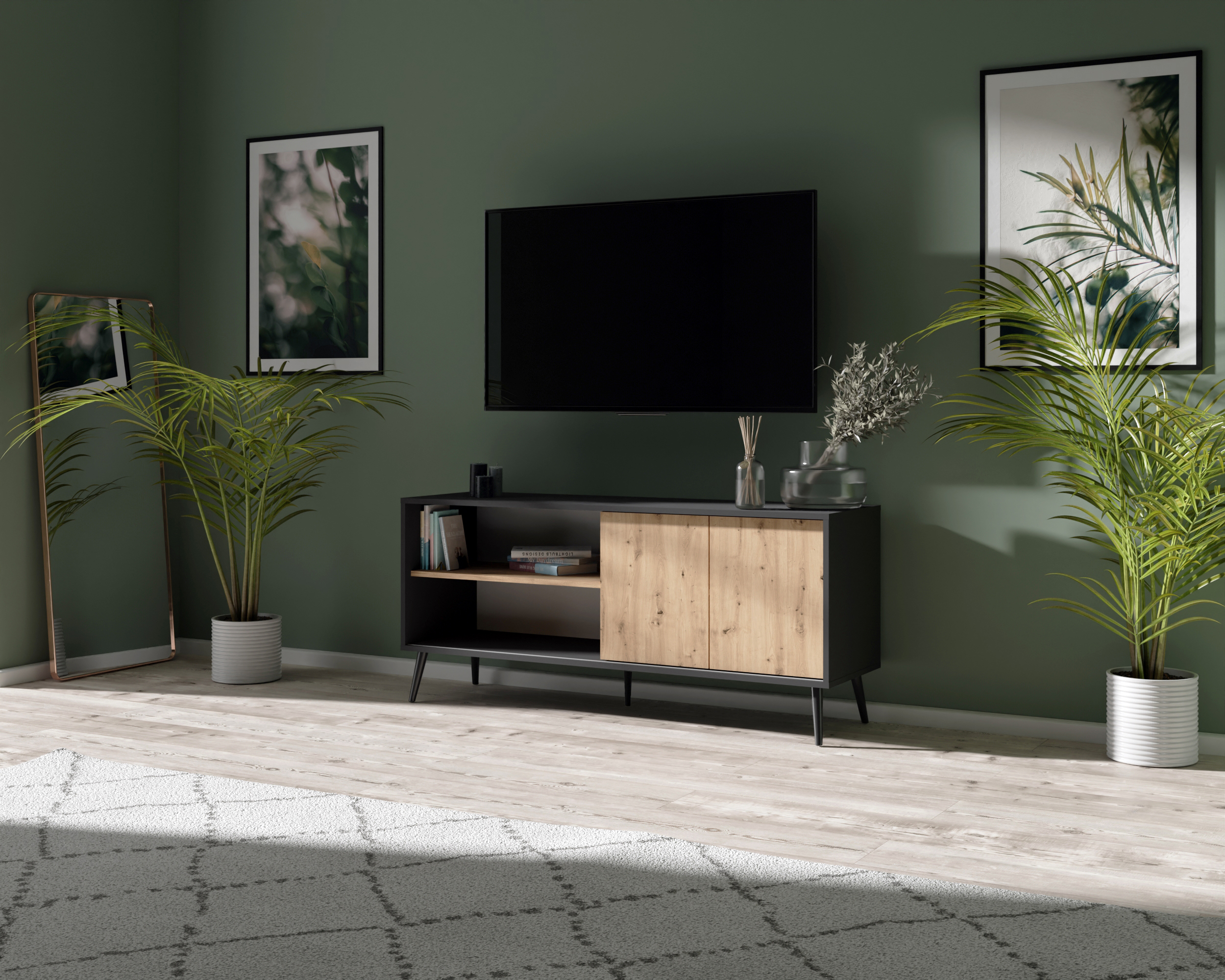 Experience the timeless allure of midcentury modern design with our stunning black and oak TV stand. Combining sleek sophistication with functional versatility, this standout piece boasts both cabinets and shelves to neatly store your media essentials and display your cherished belongings. The striking contrast of black and oak finishes adds a touch of elegance, while the clean lines capture the essence of midcentury charm. Elevate your entertainment space with a TV stand that effortlessly blends style and practicality, making a statement in any room.