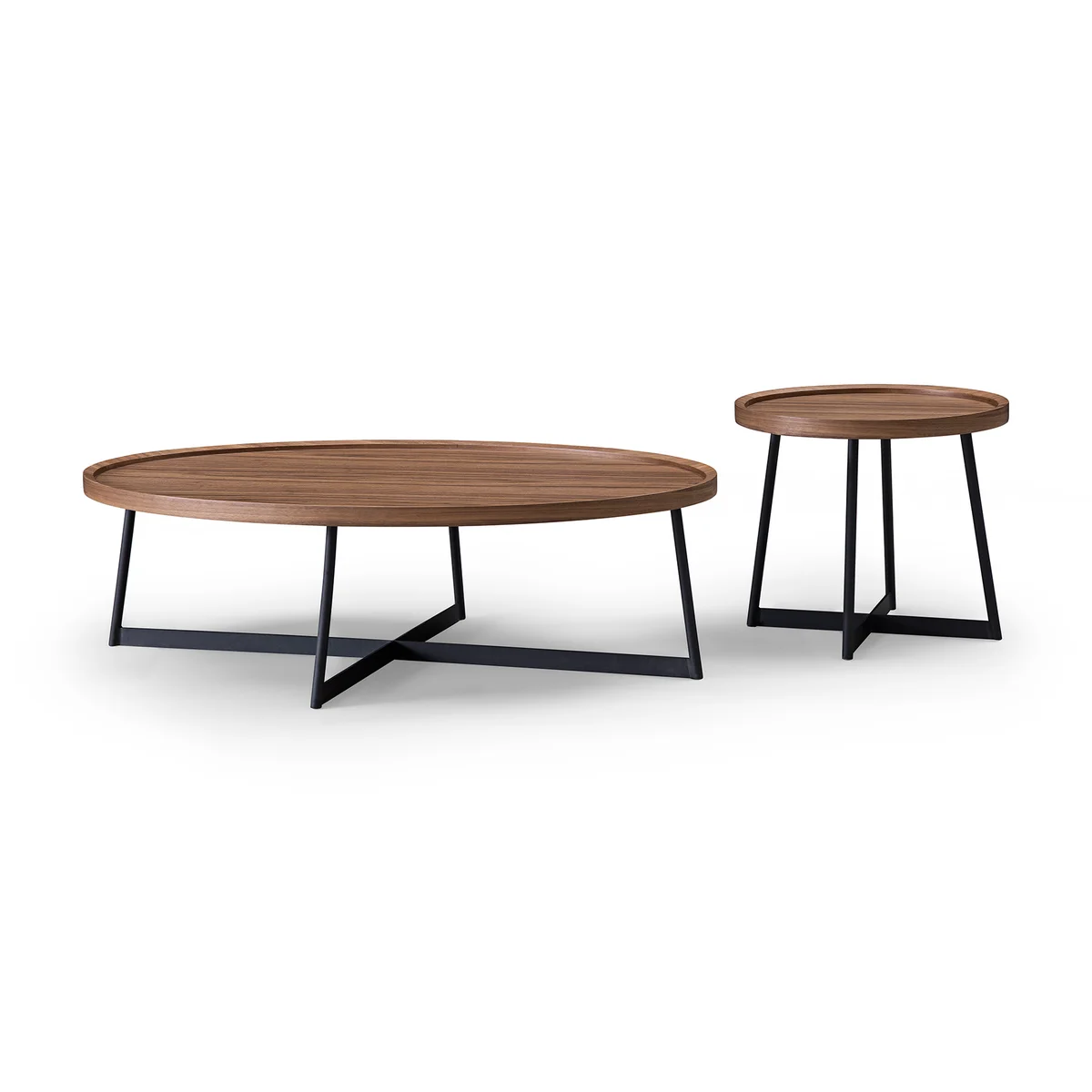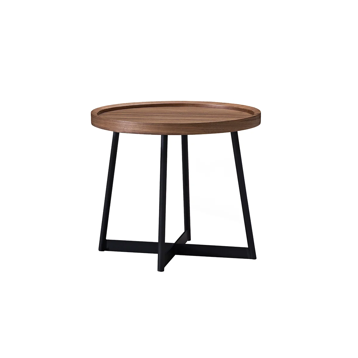 The table is supported by a sturdy black metal base, providing a bold contrast to the walnut top and ensuring long-lasting durability. Its clean, minimalist lines make it a versatile accent piece that fits seamlessly into modern, industrial, or contemporary interiors.