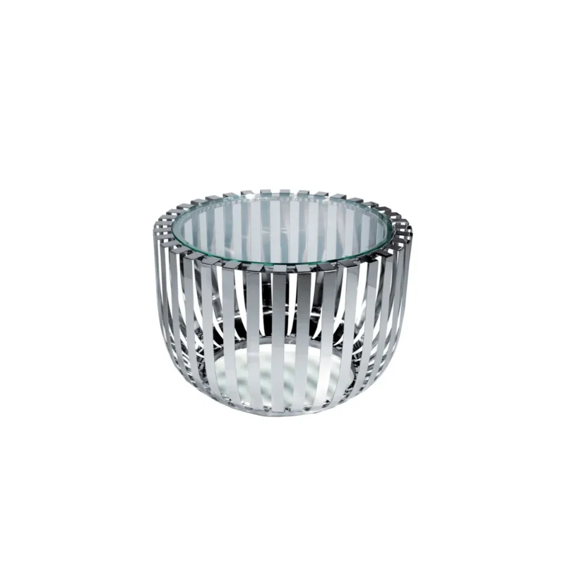 The polished stainless steel base provides stability and adds a refined, contemporary touch with its gleaming finish. Its versatile size — Diameter: 28″ x Height: 20″ — makes it perfect as a side table beside a sofa, armchair, or bed, offering both style and functionality.