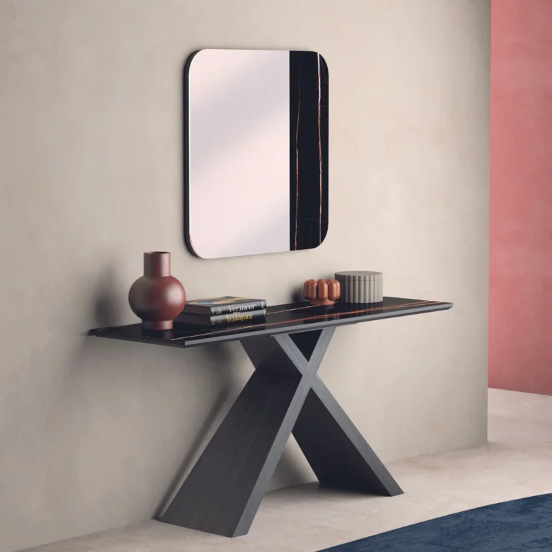 The solid ash legs add warmth and stability, beautifully balancing the modern surface with natural wood craftsmanship. With its generous proportions — Length: 61″ x Depth: 19″ x Height: 30″ — the Sassari ST functions perfectly as a sofa table, console, or entryway accent, offering both style and functionality.