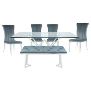 The Beaufort six-piece dining set features an Art Deco design with a chrome table, glass top, tufted chairs, and a velvet bench, perfect for modern glam.