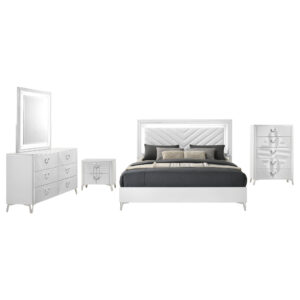 $2,371.00Cassia offers a sculptural white high gloss bedroom set with LED headboard, LED dresser mirror, chrome pulls, and felt-lined drawers.