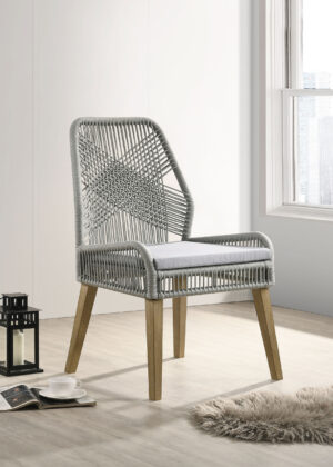 $857.00The Nakia dining chair features a sleek grey woven seat, weathered wood legs, and an artful design, perfect for casual spaces and sun porches. -