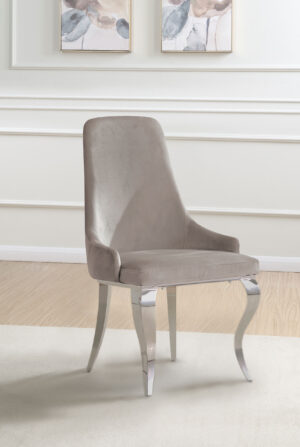 $631.00Experience elegance with the Antoine upholstered side chairs. Soft velvet, chrome legs, and cushioned seats offer luxury and comfort for dining. -